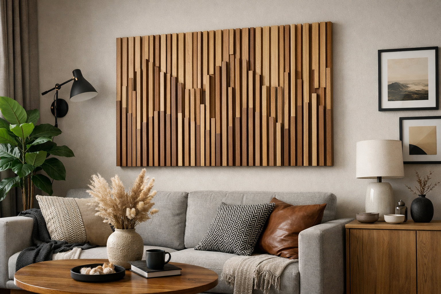 Holzpaneele müssen nicht ausschließlich wandfüllend wirken. Horizontale Streifen auf halber Wandhöhe schaffen optische Gliederung und lenken den Blick gezielt. Vertikale Installationen strecken niedrige Räume, während geometrische Muster als dreidimensionale Kunstwerke funktionieren. Besonders reizvoll wirken Kombinationen verschiedener Holztöne, die Farbverläufe erzeugen oder bewusste Kontraste setzen.