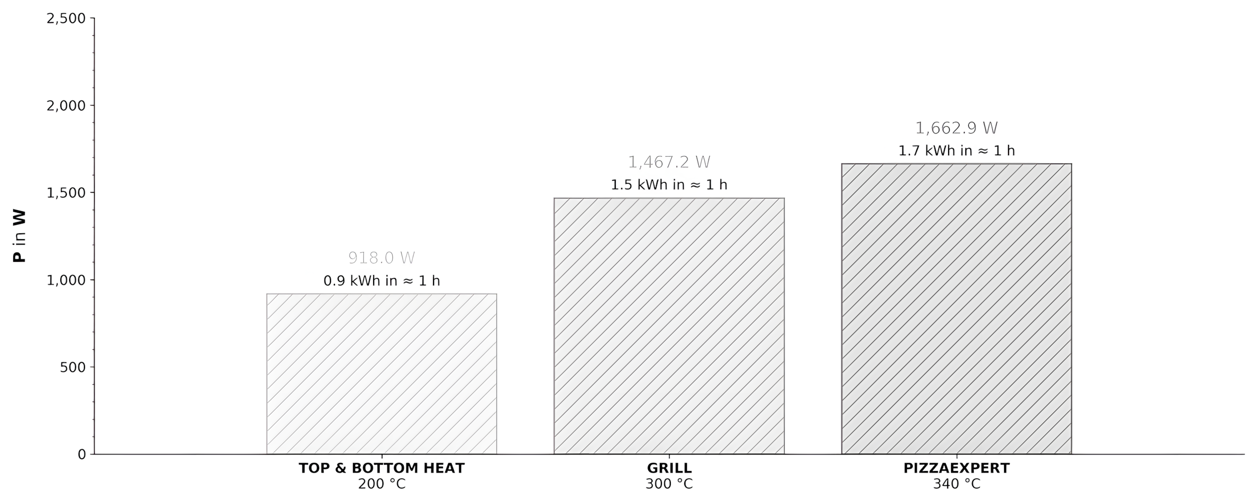 TOP/BOTTOM HEAT 200 °C: 918.0 or 3,121.3 W GRILL 300 °C: 1,467.2 or 2,152.9 W PIZZAEXPERT 340 °C: 1,662.9 or 3,005.9 W |