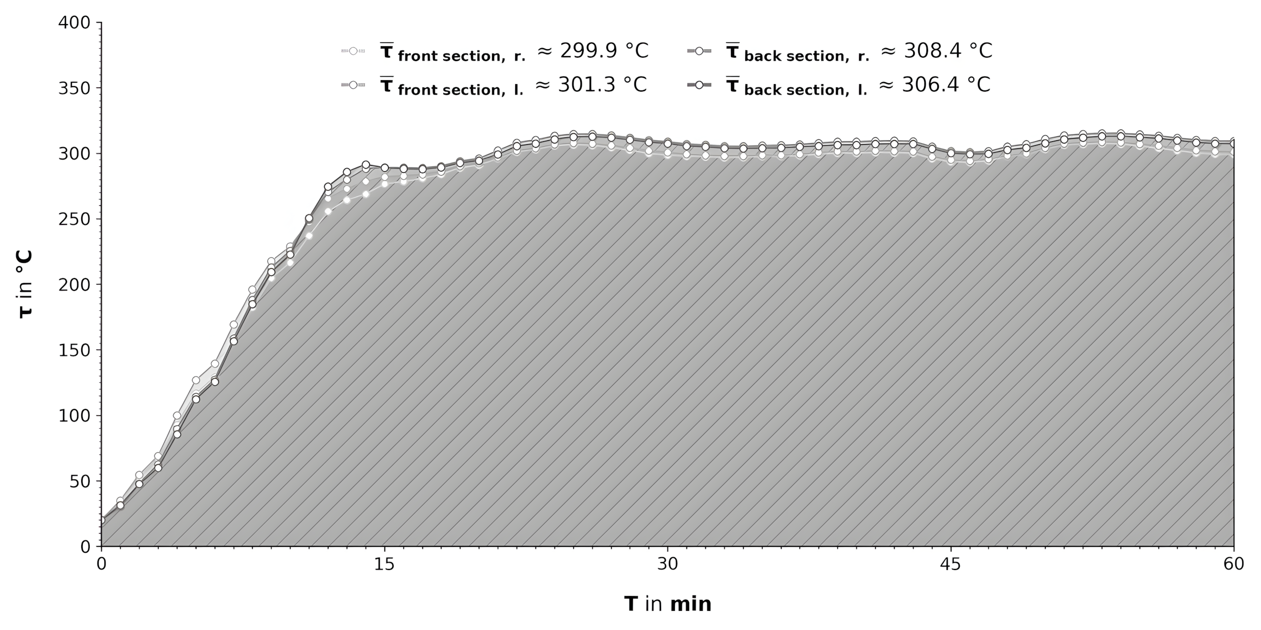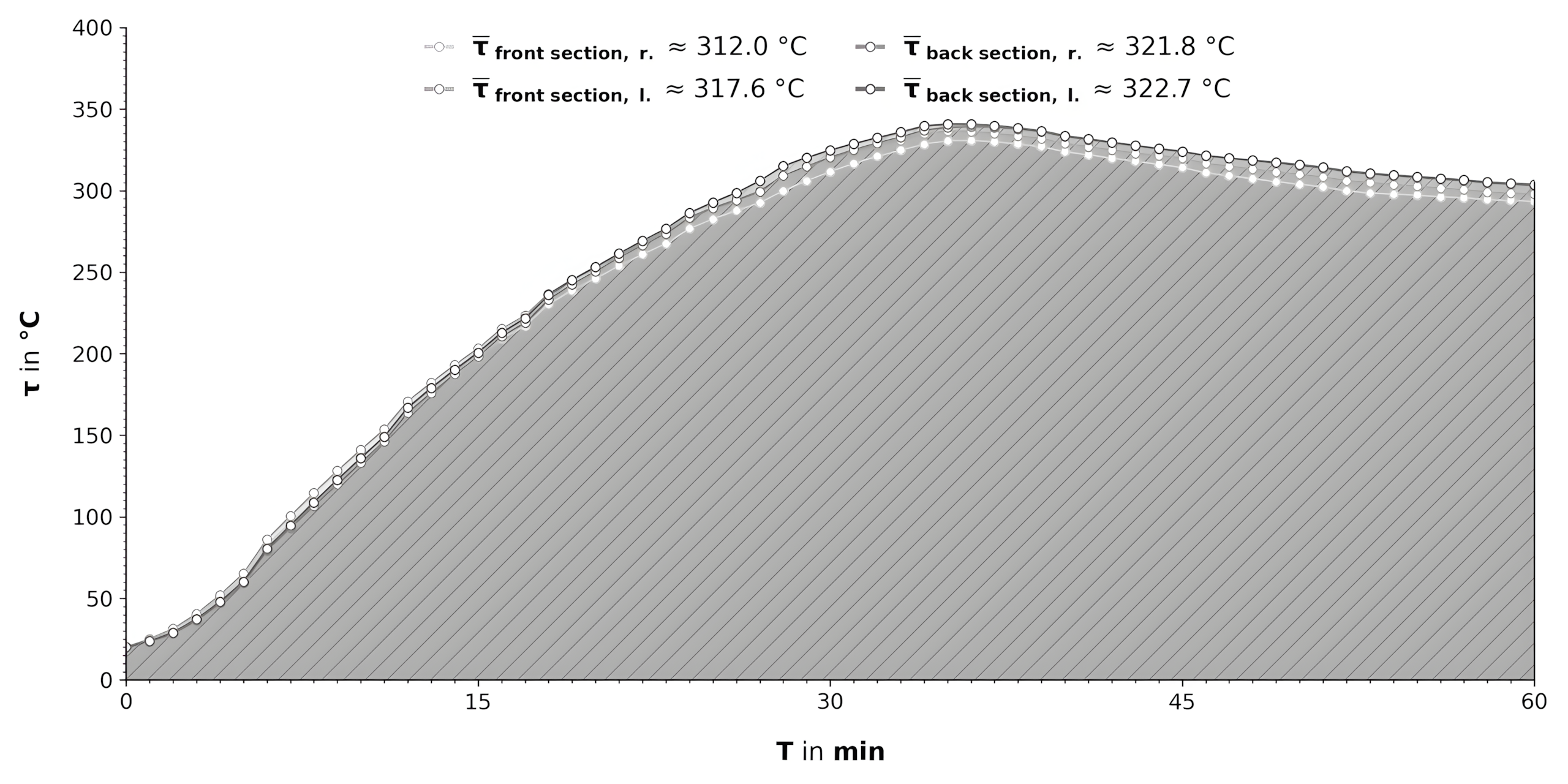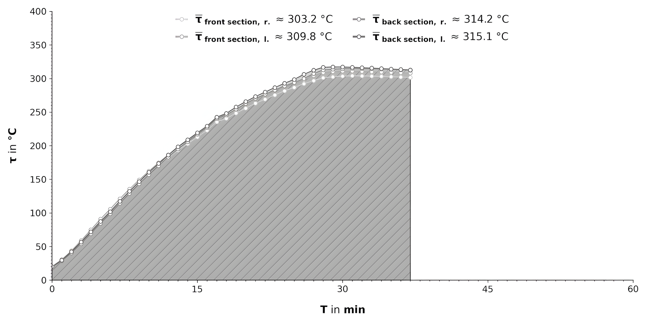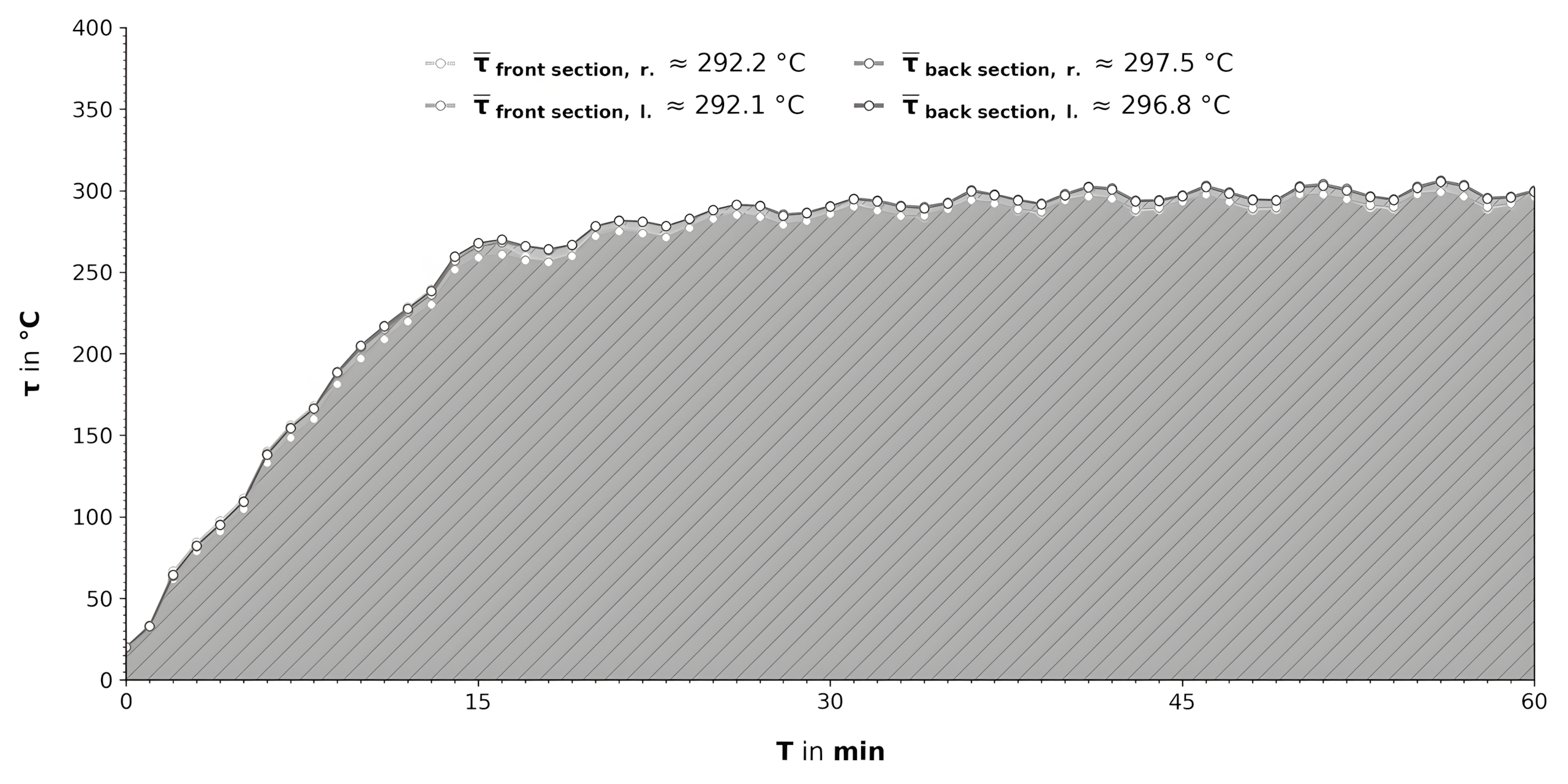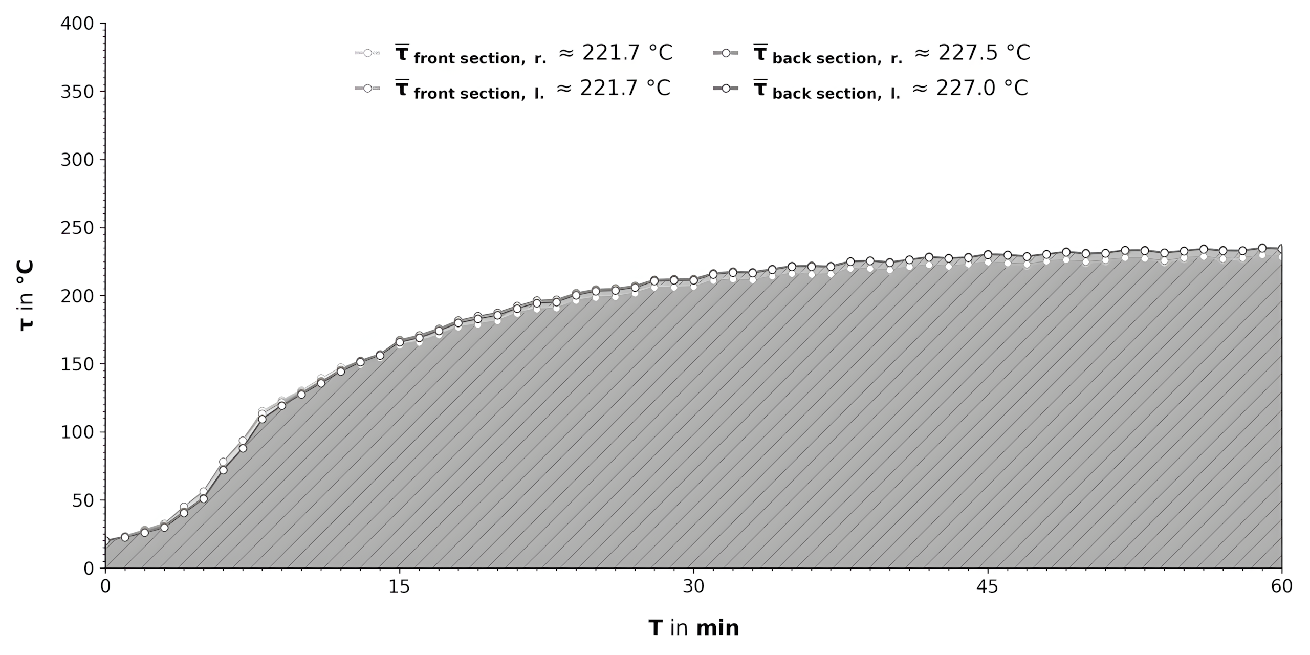 This graph shows very clearly that the temperature levels in the oven cavity of the BBI4S8HM1SK are never completely stable: they are indeed fairly uniform in all areas of the cavity, but fluctuate considerably during the cooking program. We illustrate this here using the model’s special pizza program, in which temperature peaks of max. ≈ 315.1 °C are reached. That the temperatures become so enormous is surprising because, as we already indicated in our impressions, the browning performance was unfortunately only mixed.