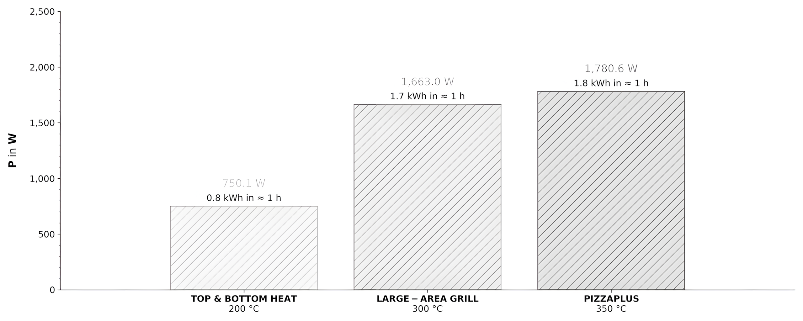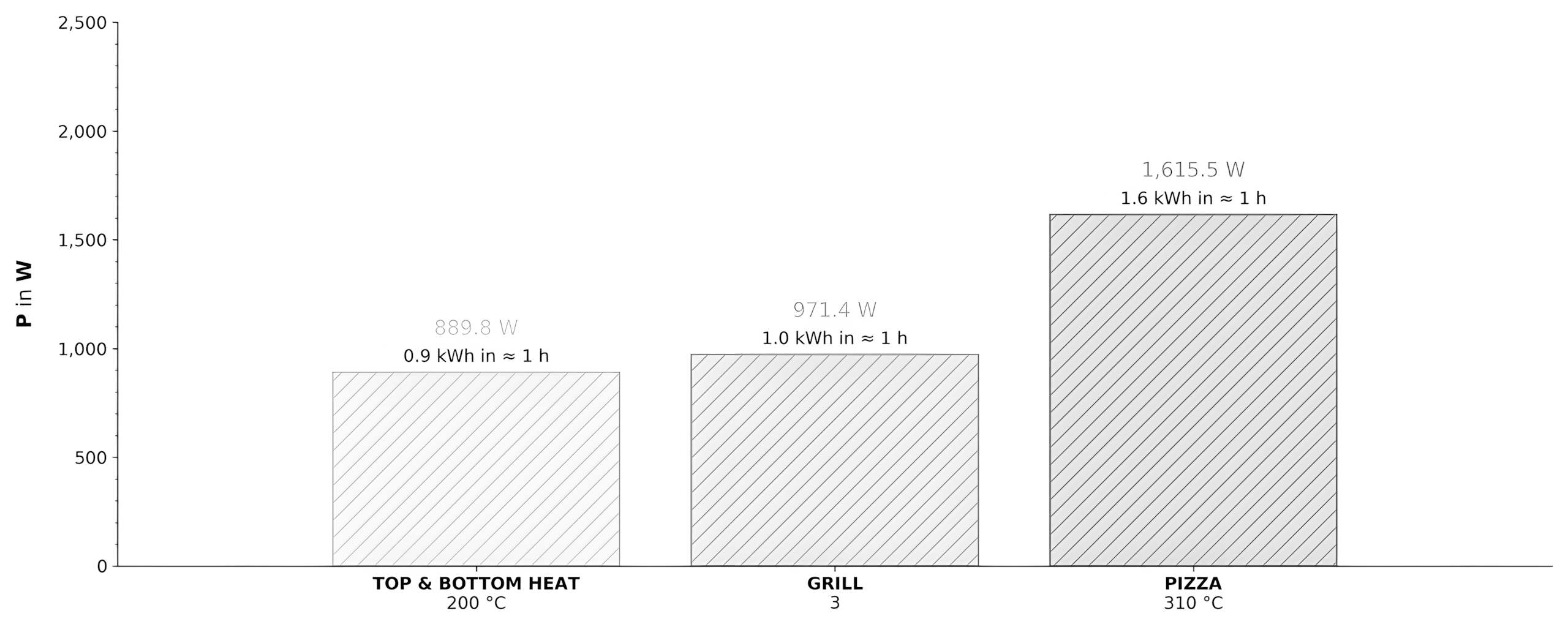 TOP AND BOTTOM HEAT 200 °C: 750.1 or 2,258.1 W GRILL 300 °C: 1,663.0 or 2,120.6 W PIZZAPLUS 350 °C: 1,780.6 or 2,086.8 W |