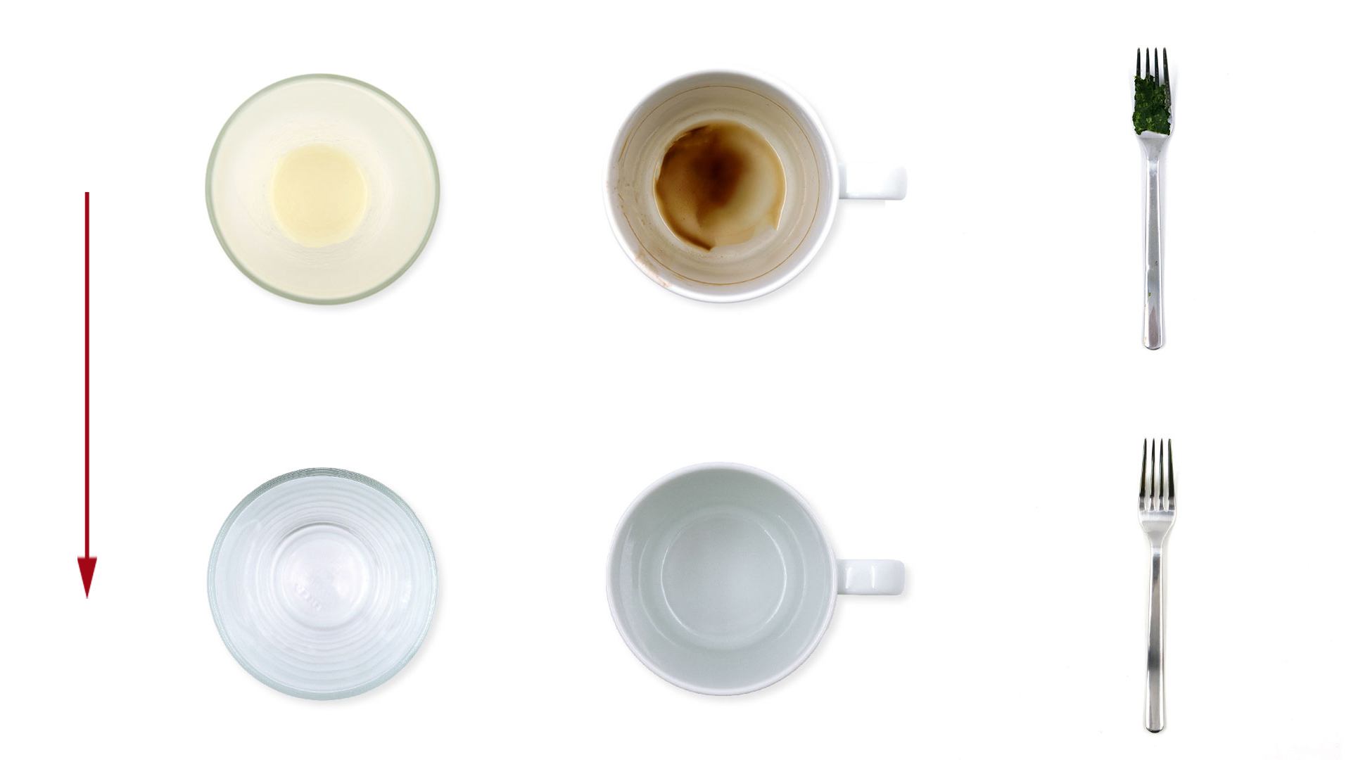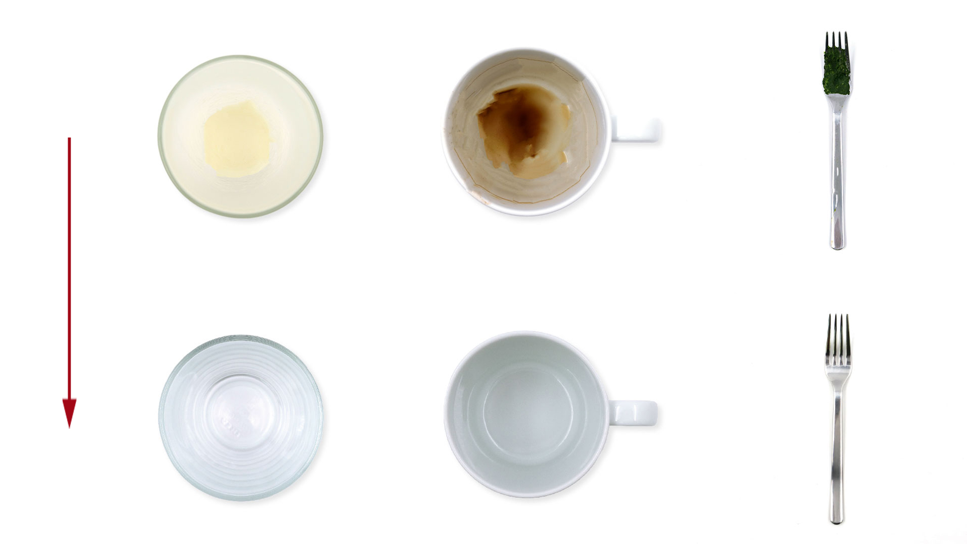 Hier haben wir vor allem die Spülleistung des Modells beurteilt: Das Geschirr wurde vor jedem einzelnen der mehrmals wiederholten Spülgänge gleichmäßig mit verschiedenen Speiserückständen versehen und anschließend bei einer Temperatur von ≈ 24 °C (t∅ d. Labors) und einer relativen Feuchte von ≈ 70 % (φ∅ d. Labors) über einen Zeitraum von 12 h gelagert. Mit welchen Speiserückständen und mit wie viel von ihnen das Geschirr vor den einzelnen Spülgängen vorbereitet wurde, war auch von dem jeweiligen Geschirr abhängig: Wir verteilten also schwere Flecken (bspw. von Milch, Püree, Saucen und Spinat), mittel-leichte bzw. mittel-schwere Flecken (bspw. von Espresso, Marmeladen, Sirups usw.) und leichte Flecken (bspw. von Butter, Suppen und Schokolade mit einem Kakaoanteil i. H. v. ≈ 70 %) über dem Geschirr. Neben der Spülleistung wurde auch die Trocknungsleistung ermittelt. Jedes einzelne Geschirrstück wurde von uns nach Beendigung des jeweiligen Spülgangs von allen Seiten hinsichtlich der vom Modell erbrachten Spül- und Trocknungsleistung bewertet. Des Weiteren wurde der mit den weiteren Funktionen eines Modells verbundene Mehrwert aus der Perspektive durchschnittlicher Verbraucherinnen & Verbraucher benotet. So wurde nach Beendigung eines jeden Spülgangs bspw. auch erhoben, ob der verwendete Tab auch wirklich rückstandslos im Wasser verschwunden ist.