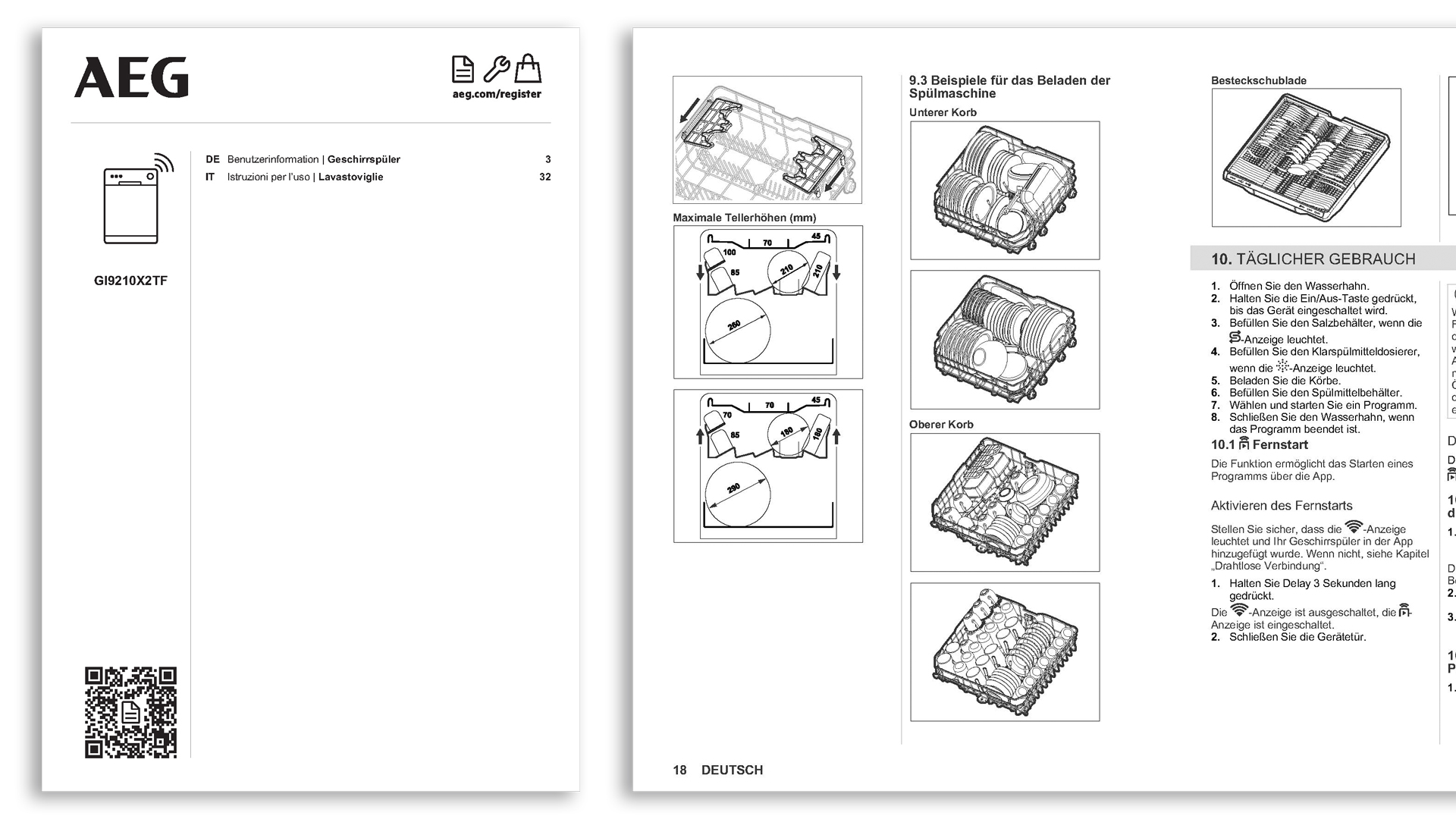 Die Bedienungsanleitung der GI921OX2TF ist von exzellenter Qualität: Schließlich stellt AEG alles, was man während des vollen Bedienungsvorgangs wissen muss, in einem sehr einprägsamen Stil dar, den wirklich jedermann verstehen wird. Grandios ist, dass allen wählbaren Spülprogrammen, Spüloptionen usw. einzeln nachgegangen wird, sodass erkennbar wird, wann man welches von ihnen verwenden sollte: Die Darlegungen von AEG sind in diesem Teil sehr viel detaillierter als das, was viele andere Hersteller veranschaulichen. Die Bedienungsanleitung ist außerdem voller schwarz-weißer Graphiken, die vor allem in den anschließenden Abschnitten, die sich dem Anordnen des Geschirrs im Spülraum widmen, wertvoll sind: Hier stellt AEG sehr anschaulich dar, wo man das Geschirr im Spülraum verteilen sollte, dank welcher Mechaniken man das Geschirr während des Spülvorgangs sichern kann uvm. Gerade Schalen, Schüsseln usw. werden nur dann wirklich sauber, wenn sie in einem solchen Winkel im Modell verweilen, dass ein ausreichendes Maß an Wasser sie voll ausspülen kann.