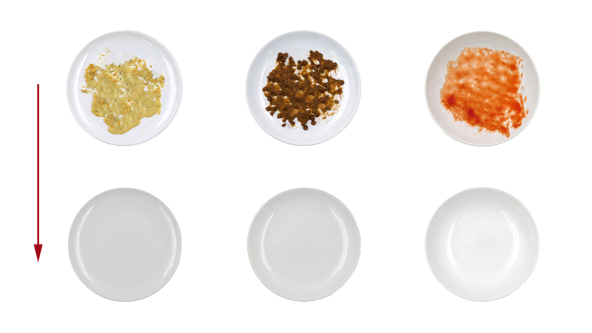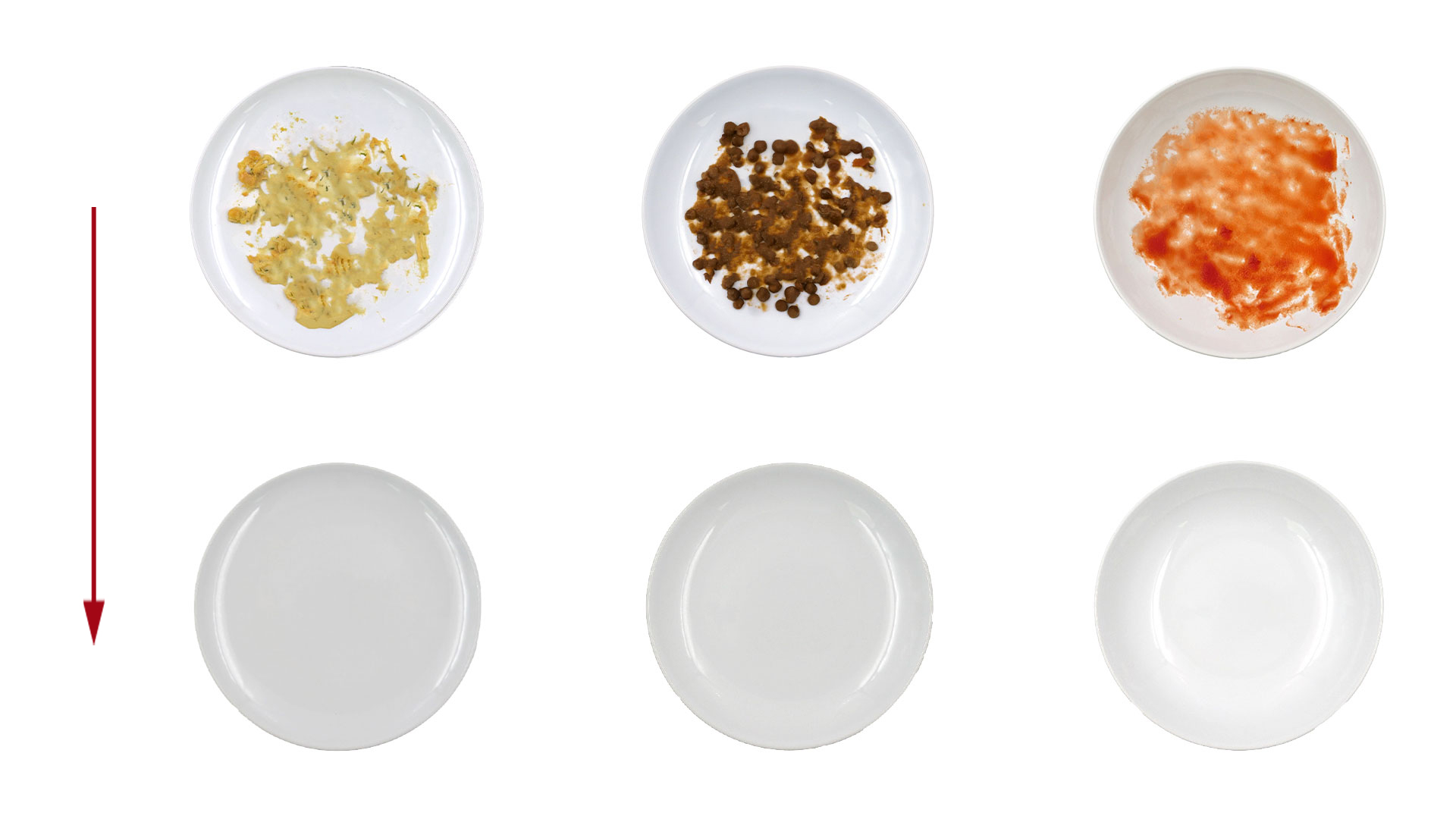 Hier haben wir vor allem die Spülleistung des Modells beurteilt: Das Geschirr wurde vor jedem einzelnen der mehrmals wiederholten Spülgänge gleichmäßig mit verschiedenen Speiserückständen versehen und anschließend bei einer Temperatur von ≈ 24 °C (t∅ d. Labors) und einer relativen Feuchte von ≈ 70 % (φ∅ d. Labors) über einen Zeitraum von 12 h gelagert. Mit welchen Speiserückständen und mit wie viel von ihnen das Geschirr vor den einzelnen Spülgängen vorbereitet wurde, war auch von dem jeweiligen Geschirr abhängig: Wir verteilten also schwere Flecken (bspw. von Milch, Püree, Saucen und Spinat), mittel-leichte bzw. mittel-schwere Flecken (bspw. von Espresso, Marmeladen, Sirups usw.) und leichte Flecken (bspw. von Butter, Suppen und Schokolade mit einem Kakaoanteil i. H. v. ≈ 70 %) über dem Geschirr. Neben der Spülleistung wurde auch die Trocknungsleistung ermittelt. Jedes einzelne Geschirrstück wurde von uns nach Beendigung des jeweiligen Spülgangs von allen Seiten hinsichtlich der vom Modell erbrachten Spül- und Trocknungsleistung bewertet. Des Weiteren wurde der mit den weiteren Funktionen eines Modells verbundene Mehrwert aus der Perspektive durchschnittlicher Verbraucherinnen & Verbraucher benotet. So wurde nach Beendigung eines jeden Spülgangs bspw. auch erhoben, ob der verwendete Tab auch wirklich rückstandslos im Wasser verschwunden ist.