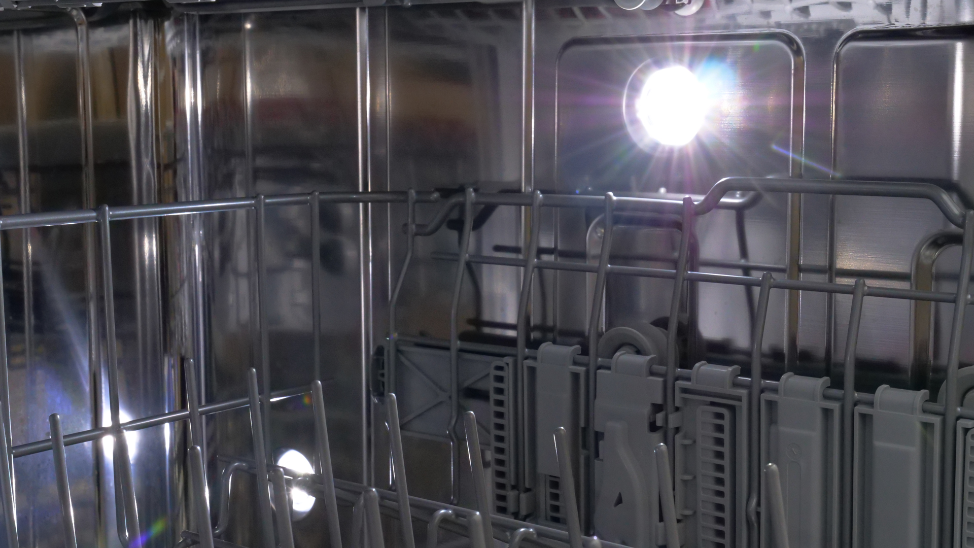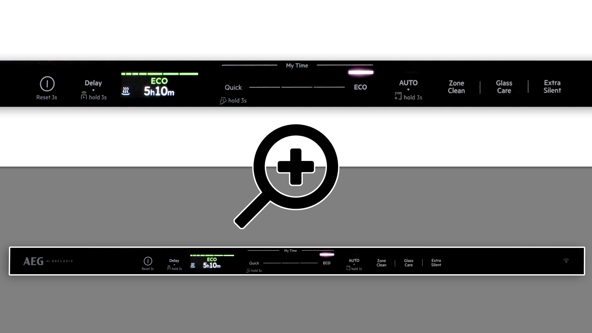 Während eines Spülvorgangs ist der Bildschirm niemals einsehbar. Anstelle dessen kann das Modell aber die verbleibende Dauer des jeweiligen Spülprogramms nach vorne hin projizieren, sodass sie sich vom Fußboden ablesen lässt. Die Größe der Projektion ist vollends ausreichend (≈ 1,5 cm). Sie ist so hell, dass man sie von dunklen wie von hellen Fußböden sicher ablesen kann.