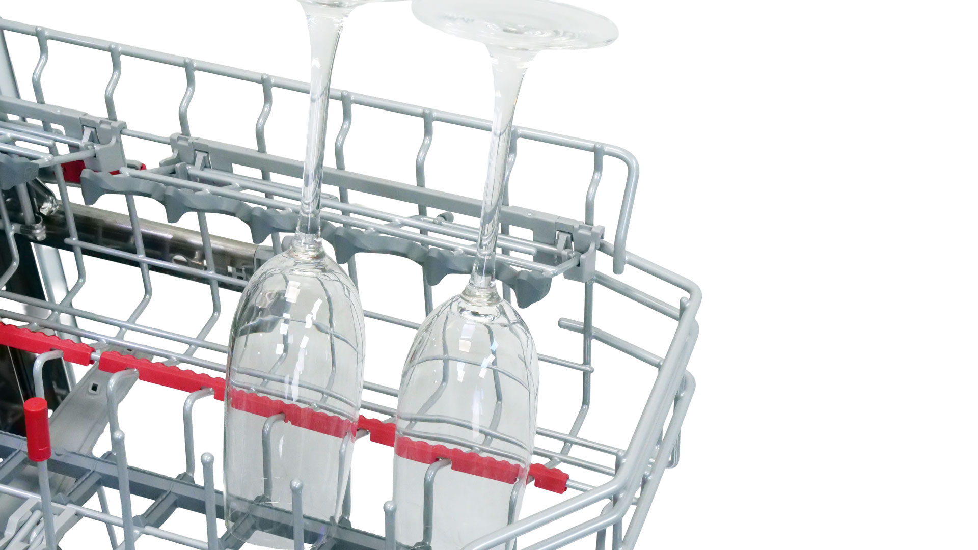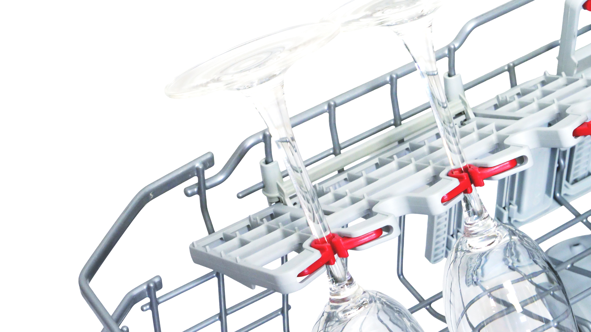 Doch sind auch verschiedene Mechaniken vorhanden, die man nach Wunsch hoch- und herabklappen kann: So lassen sich hier bspw. Gläser verschiedener Größen an den äußeren Seiten der 1. Ebene sichern, sodass sie während eines Spülprogramms in einem Winkel von ≈ 45° verweilen (SOFTGRIPS & –SPIKES). Warum das wertvoll ist? Weil das Wasser die Gläser so von allen Winkeln aus, vor allem von innen her, voll ausspülen kann: Hier verschwinden i. Ü. auch Spuren von Wein vollkommen.
