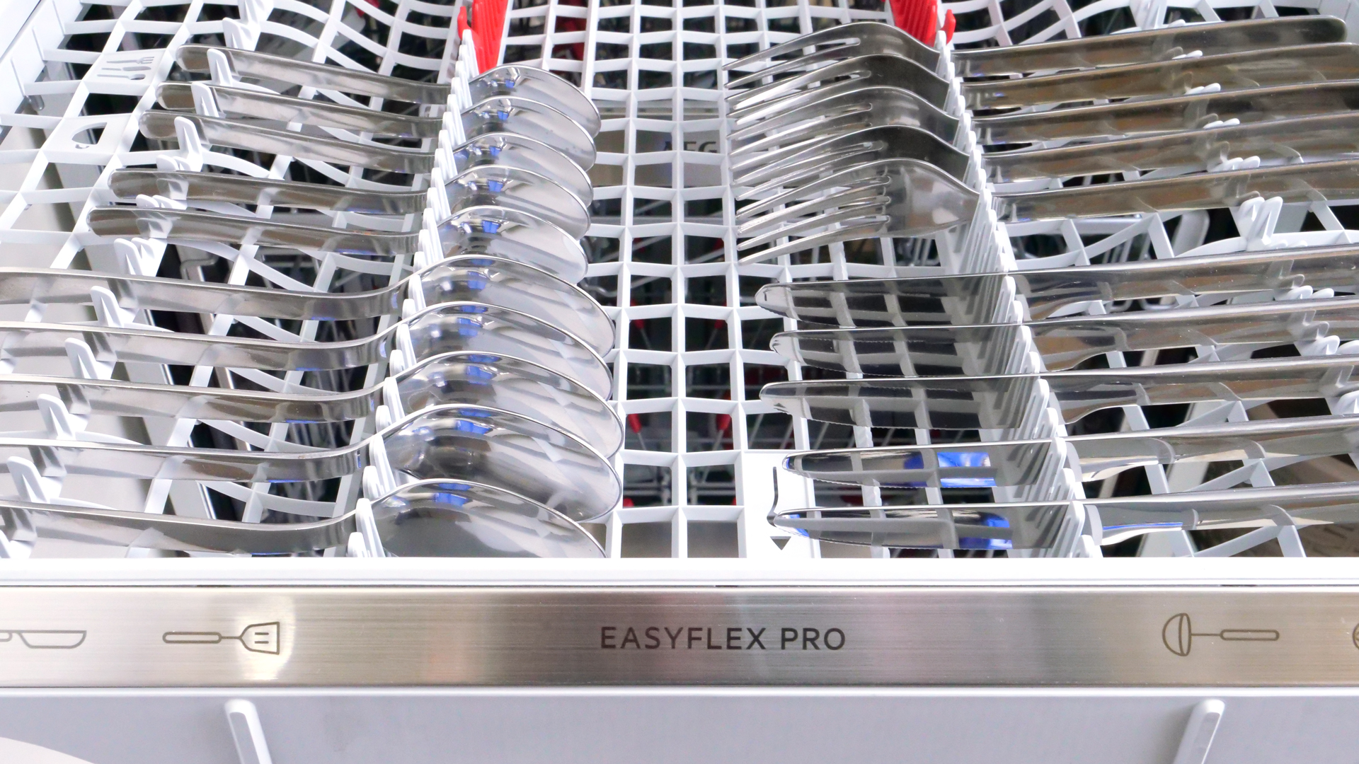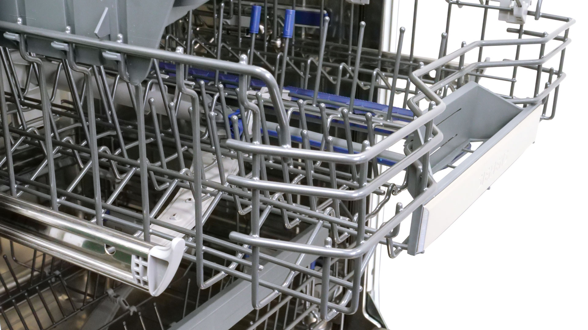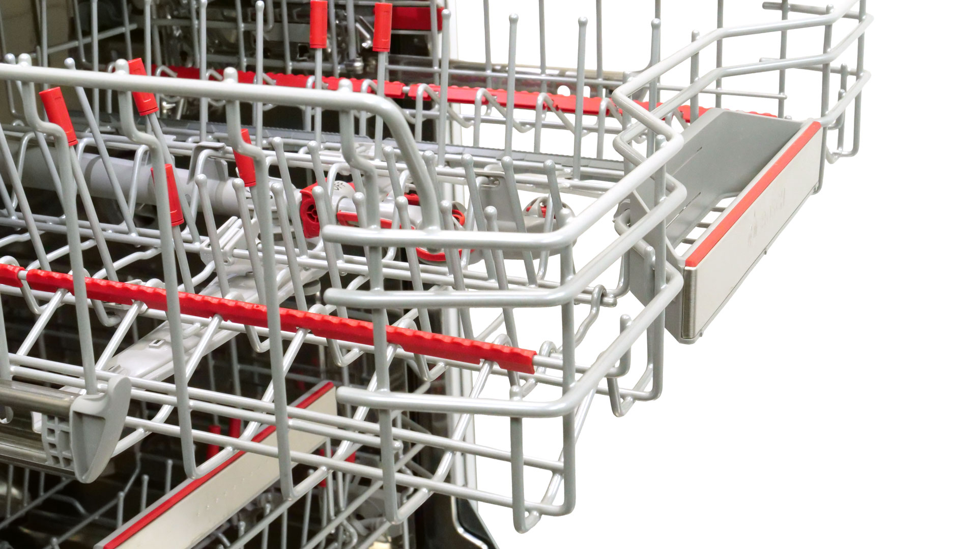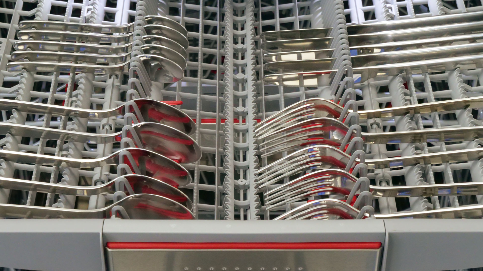 Gabeln, Messer usw. kann man in der im oberen Teil des Spülraums erreichbaren Schublade anordnen: Hier ist sehr viel Spielraum vorhanden, sodass sich Geschirr jedweder Größe in ihr verräumen lässt. Was dem ein oder anderen auch willkommen sein wird: Den verschiedenen Bereichen der Schublade wurden Graphiken verliehen, die in einem simplen, aber vollends verständlichen Stil erkennbar machen, wo man welches Geschirr deponieren sollte, wenn man die Spülleistung maximieren will.