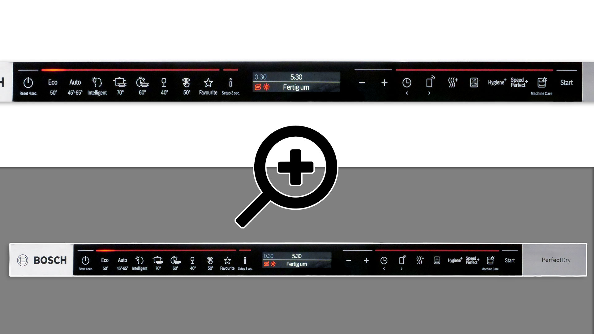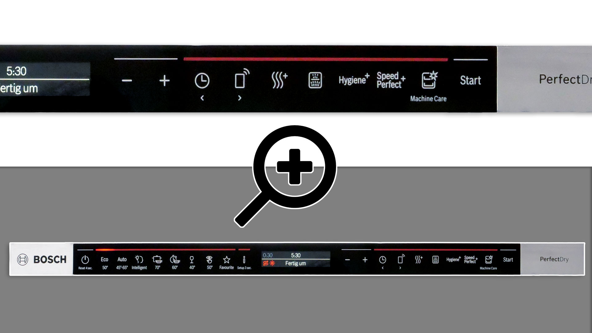 Sehr viel mehr Spielraum wird von dem Bosch SMD8TCX04E erschlossen: So ist bspw. der Oberkorb auch per RACKMATIC verstellbar (max. ≈ 5,0 cm); darüber hinaus ist indes eine Besteckschublade vorhanden, in der Messer, Gabeln & Co. von allen Winkeln aus reichlich Wasser abbekommen. Für stark verschmutztes Geschirr ist auch noch eine Spezialreinigungszone (EXTRA CLEAN ZONE) vorhanden, die in der Tat wirksam ist. Als sehr positiv stellt sich die Qualität des vorderen Screens dar; ähnlich viel Eindruck hinterließ die Bodenprojektion, die bspw. auch den aktuellen Stand des jeweiligen Spülprogramms per Animation erkennen lässt (TIME LIGHT). Monieren müssen wir das durchwachsene Ansprechverhalten des Touchpanels, weil man bisweilen mehrmals drücken muss, ehe sich eine Reaktion vom Geschirrspüler vernehmen lässt. Außerdem beleuchtet das Modell von Bosch den Spülraum nur von vorne her, sodass der hintere Bereich vor allem abends sehr viel schlechter einsehbar ist.