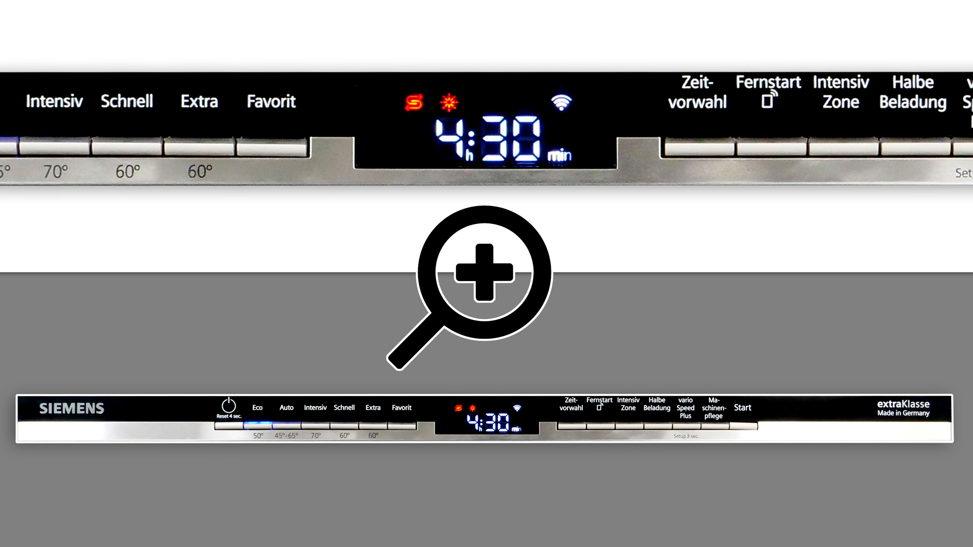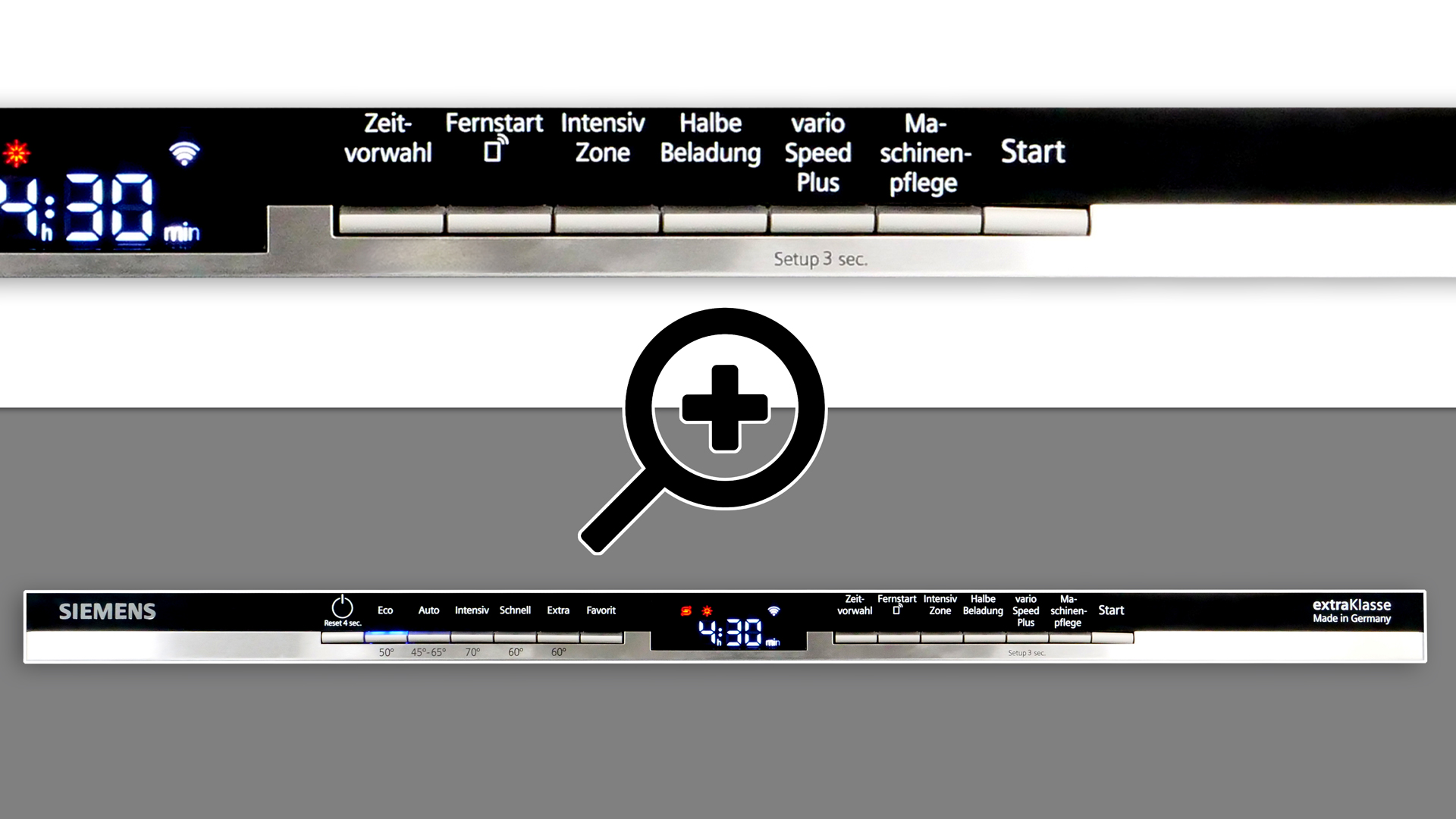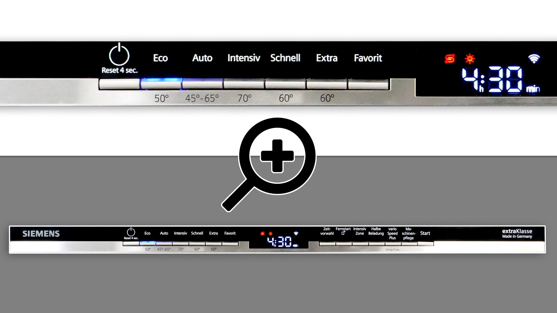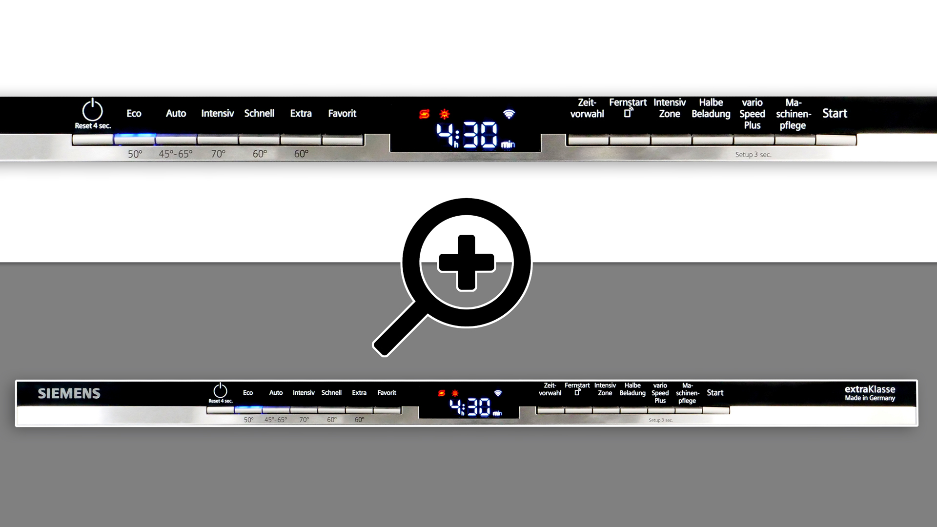 Der Siemens SN63EX02BD lässt sich ohne sonderlich viel Mühe verwenden, ist aber in der Mechanik sehr viel simpler. Den Oberkorb kann man per RACKMATIC anheben bzw. absenken (max. ≈ 5,0 cm); ein Vorteil ist die spezielle Glasreinigungszone (GLASSZONE), in der sich Glas schonend, aber doch sehr wirksam spülen lässt. Wirklich verdrossen sind wir über das Fehlen einer Schublade, in die sich Gabeln, Messer usw. ordentlich einräumen ließen; eine solche würde das Spülen wahrscheinlich wirksamer machen. Das Tastenpanel ist ein solches mit klassisch-konventioneller Mechanik; vorbildlich ist aber das sehr verlässliche Ansprechverhalten. Auch dieses Modell von Siemens verwendet eine Bodenprojektion, um über alles Wesentliche zu unterrichten (TIMELIGHT).