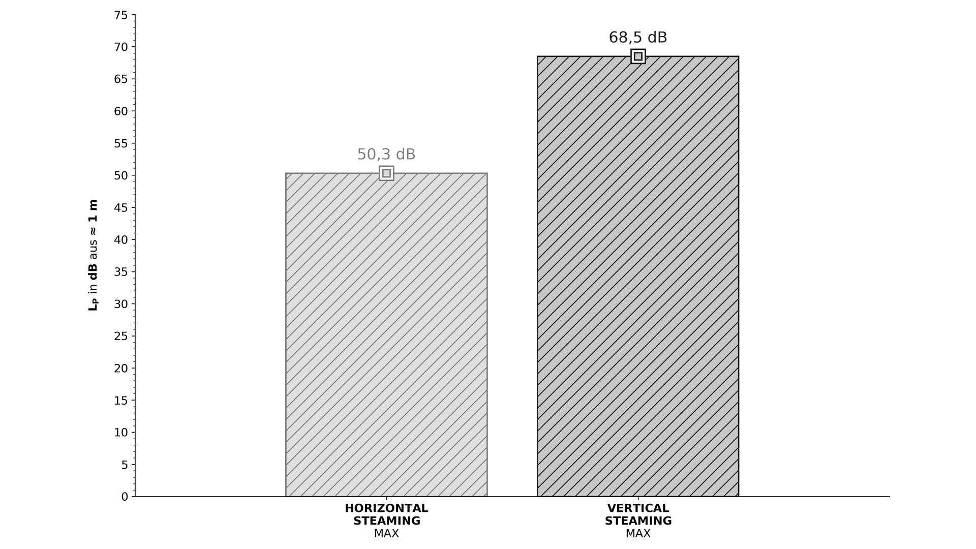- maßvoller Schallausstoß (max. ≈ 50,3 dB bzw. dB 68,5 dB aus ≈ 1 m, abhängig von der Positionierung des Modells)