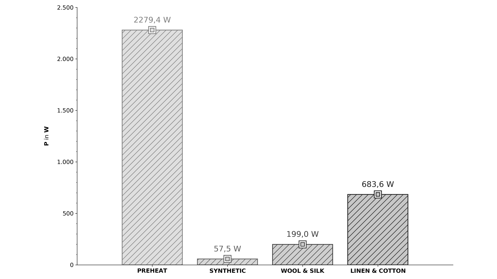 PREHEAT: 2.279,4 W; SYNTHETIC: 57,5 W; WOOL & SILK: 199,0 W; LINEN & COTTON: 683,6 W |