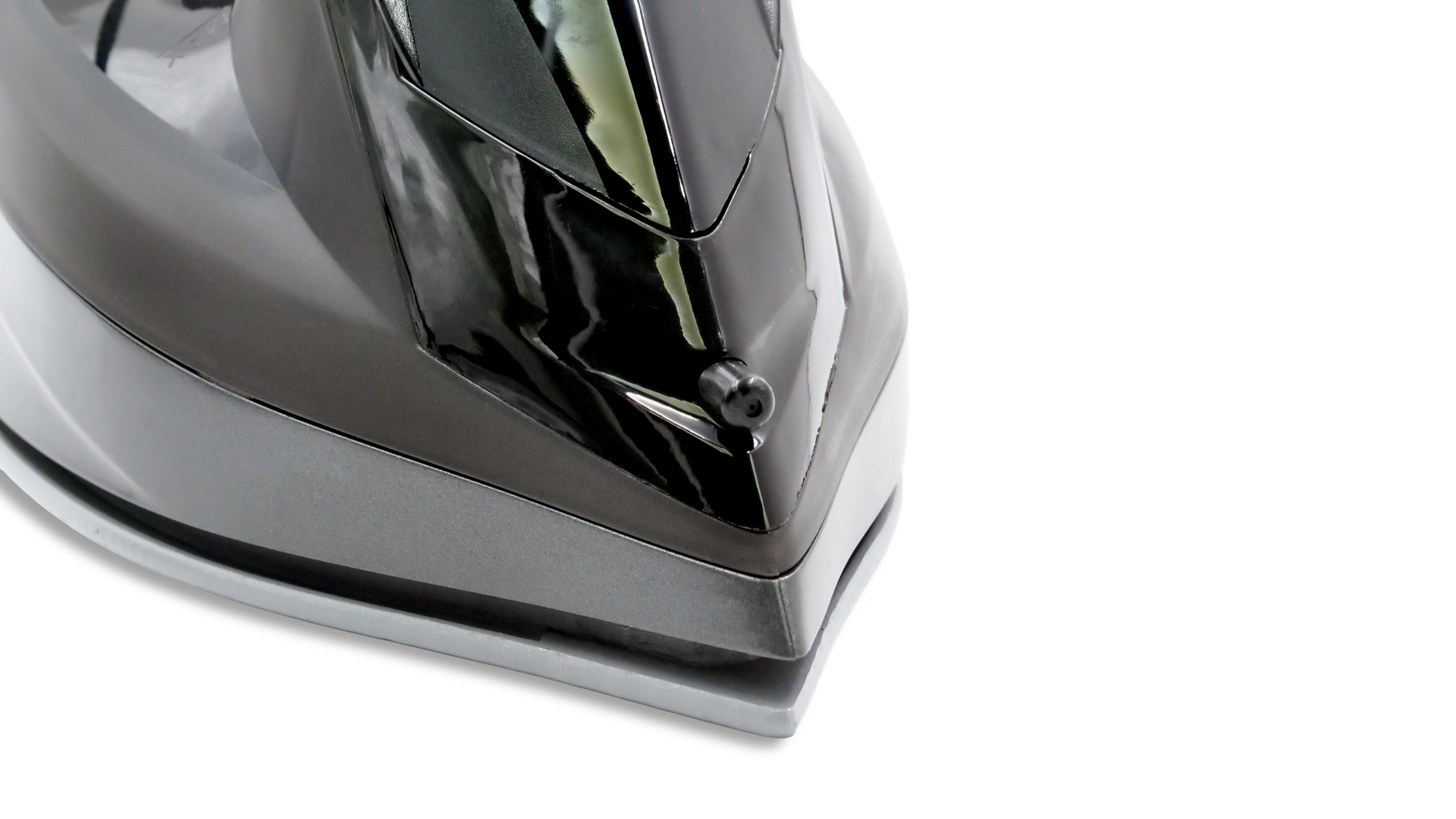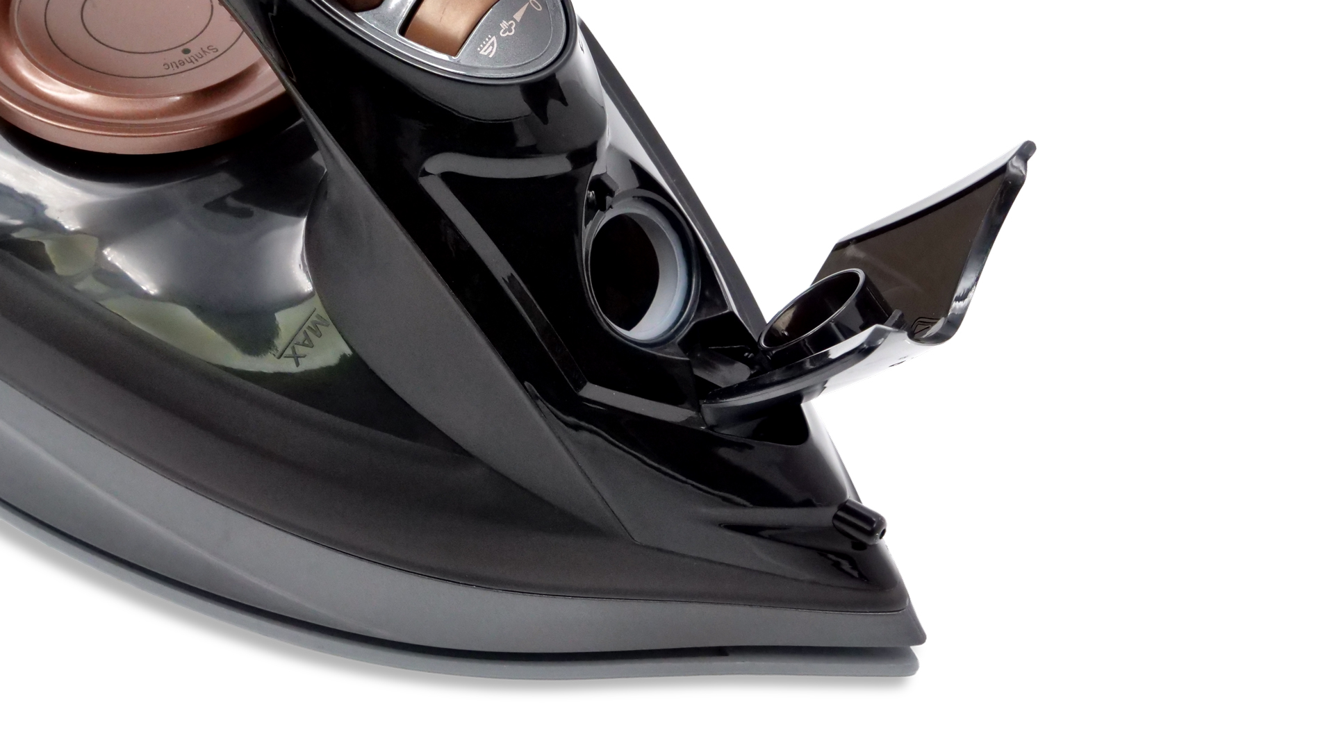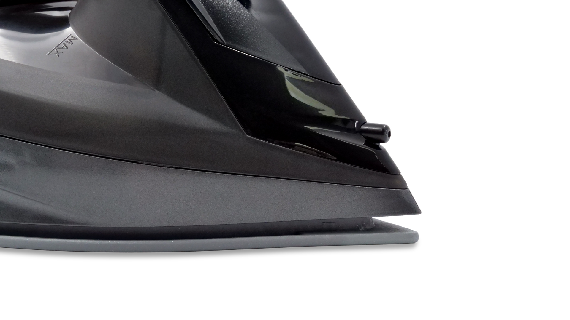 Ein Grund, aus dem man das Modell so wirksam verwenden kann, ist sicherlich auch in der hier vorhandenen Spitze der Sohle zu sehen: Sie ist solchermaßen schlank, dass man sie in wirklich alle Teile eines Textils hineinmanövrieren kann (bspw. auch in die Winkel von Biesen, Rüschen usw.). Was wir an dieser Stelle allein monieren müssen: Dem vorderen Teil der Sohle wurden leider keinerlei Auslässe verliehen, durch die sich in sehr präzisem Stil Dampf ausstoßen ließe.