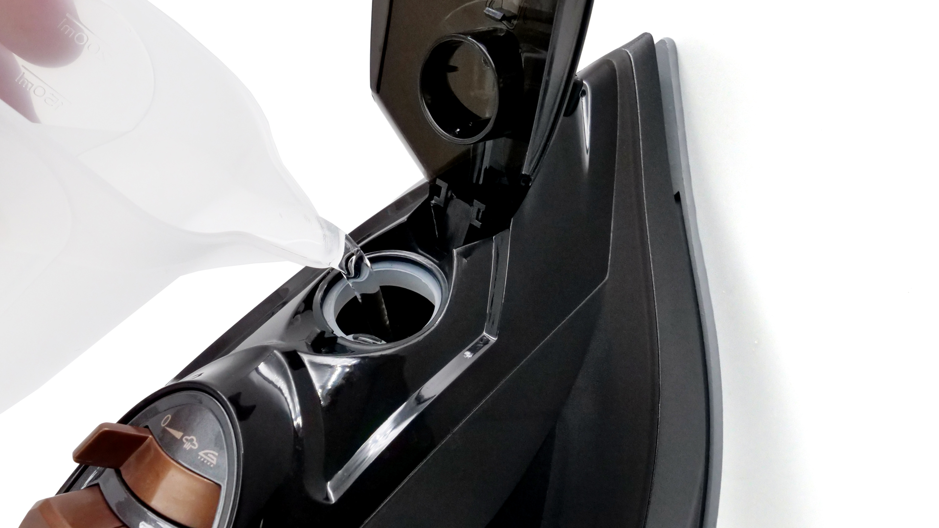 Der Wassereinlass des Steam Iron 322890 ist von vorne spielend erreichbar und wird von einem simplen Deckel verschlossen. Dank der seitlichen Materialvorsprünge kann man ihn sicher packen und im Weiteren herabklappen, sodass sich der Wassereinlass voll erreichen lässt: Die hier vorhandene Mechanik ist ein bisschen schwergängig, was man beim Herab- und Hochklappen durchaus spüren kann.
