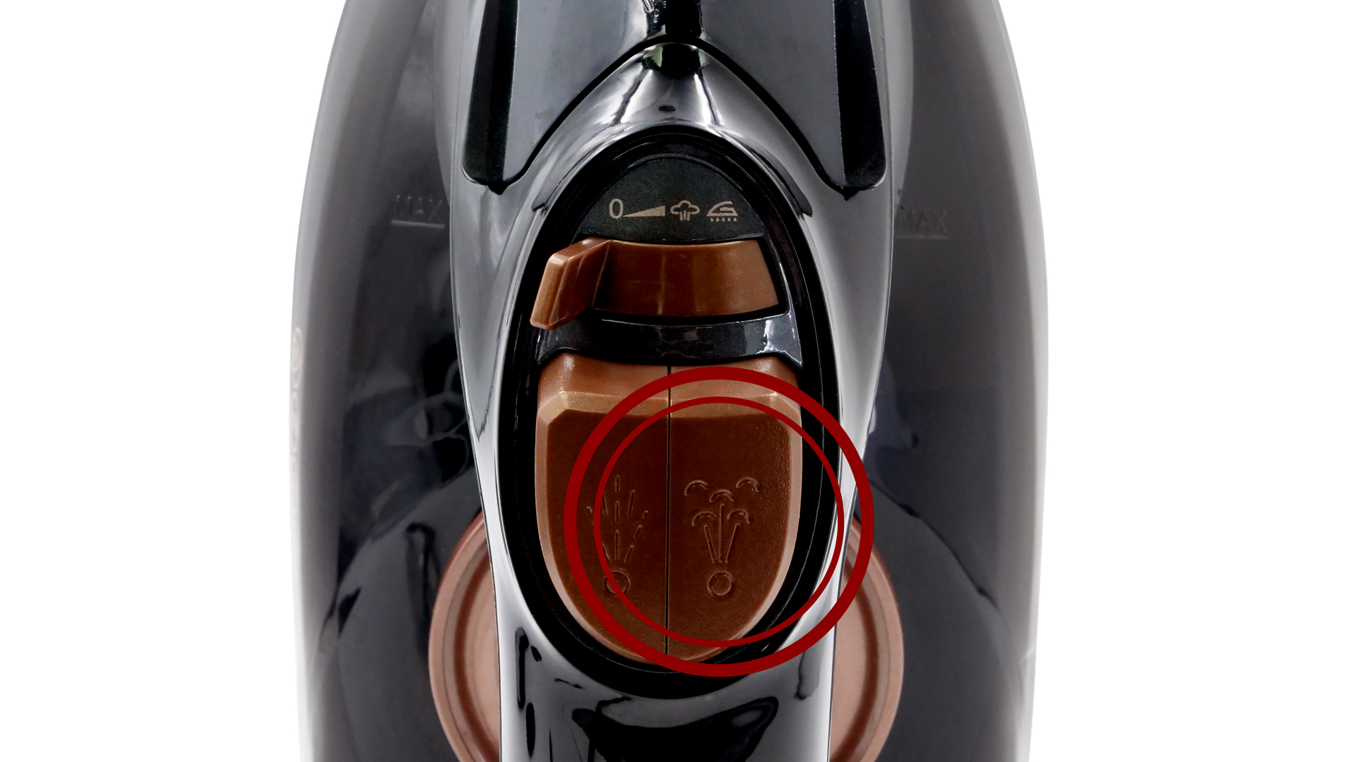 Dem Modell wurde aber auch noch eine andere, ähnlich wesentliche Taste verliehen: Durch deren Betätigung kann man das Modell veranlassen, nach vorne hin ein paar Milliliter Wasser übers Textil zu sprühen (max. ≈ 0,75 m). Dies ist aus mehreren Gründen sehr wertvoll: Durch das Wasser können viele Textilien wirksamer geglättet werden, vor allem wenn keinerlei Wasser vom vorangegangenen Waschvorgang mehr in ihnen verblieben sein sollte. Das Wasser kann das Gewebe lockern und den Glättungsvorgang dadurch in erheblichem Maße erleichtern.