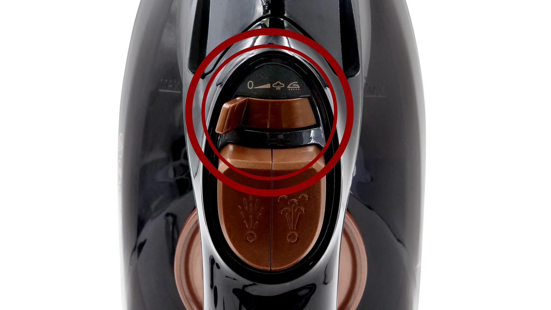 Will man seine Textilien dampfpflegen, so muss man sich nur diesen Schieber vornehmen. Er lässt sich auch während des Bügelvorgangs mühelos mit dem Daumen erreichen, gleichgültig ob man die Bügelbewegungen nun mit der einen oder mit der anderen Hand vornimmt. Hierüber lässt sich der Dampfausstoß vollkommen ausschalten (s. Bild, 1. Schieberposition v. l.) oder so anschalten, dass das Modell ihn während des Bügelvorgangs in regelmäßigen Abständen von allein vornimmt (s. Bild, 2. u. 3. Schieberposition v. l.); schließlich kann man auch einen punktuellen, leistungsmäßig sehr starken Dampfausstoß vornehmen, dessen Gebrauch sich vor allem während des vertikalen Dampfpflegens der Textilien empfiehlt (s. Bild, 4. Schieberposition v. l.).