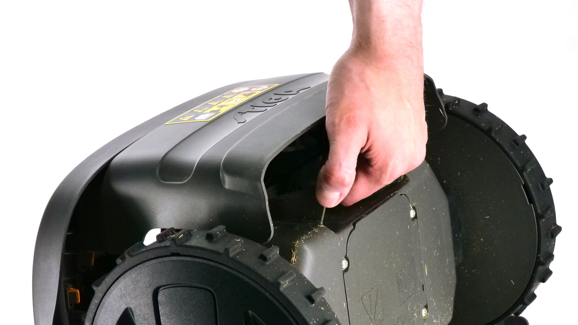 An der Rückseite des Gehäuses befindet sich ein Griff, an dem man den Mähroboter gut mit einer Hand packen und umhertragen kann. Der Griff lässt sich zwar einfach erreichen, ist jedoch nur schwer erkennbar, wenn man vor dem Modell steht. Wünschenswert wären daher bspw. Symbole am Gehäuse, welche gut sichtbar auf den Griff hinwiesen; anderenfalls ist man womöglich versucht, den Roboter an einer anderen Stelle zu packen.