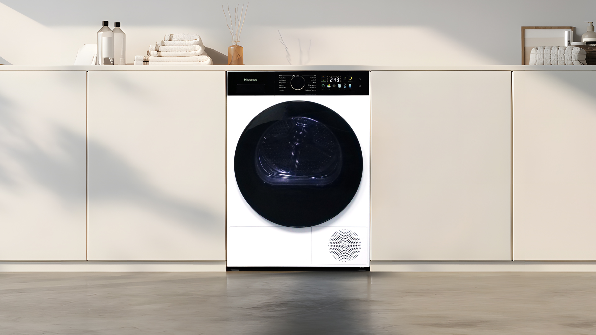 Durch einen modernen Trockner wird das Leben sehr viel leichter: Schließlich ist das Trocknen der Wäsche ohne einen solchen ausgesprochen langwierig, was vor allem in der jetzigen Saison erhebliche Probleme verursachen kann. Ein starker Trockner kann den Trocknungsvorgang nicht nur außerordentlich wirksam vornehmen: Mit passenden Trocknungsprogrammen kann man das Trocknungsverhalten sehr individuell anpassen, gleichgültig welche Textilien man dem Trockner anvertrauen will. Gerade in der aktuellen Generation stellen sich moderne Trockner auch noch als sehr sparsam dar: Trockner mit einer modernen Wärmepumpe verbrauchen in einem Großteil der Trocknungsprogramme nur in sehr überschaubarem Maße Strom, sodass man auch mehrere Trocknungsvorgänge pro Woche verwirklichen kann, ohne dass der jeweilige Strompreis wesentlich wäre. Sollte man also noch einen älteren Trockner im Haus haben, kann sich der Erwerb eines neuen Modells in mehreren Hinsichten lohnen: Nicht nur ist das Gebrauchserlebnis sehr viel intuitiver und der während des Gebrauchs erschlossene Spielraum rundherum eindrucksvoller; man kann vielmehr auch in enormem Maße sparen, was vor allem in Mehrpersonenhaushalten wertvoll ist. Wir hatten dieses Mal einen Trockner von Hisense im Test, der schon äußerlich Eindruck machen kann, sich aber vor allem leistungsmäßig hervorheben will: Den brandneuen Hisense DH3I802BWCD. Wie leicht oder schwer sich dessen Gebrauch darstellt, wie individuell man den Trocknungsvorgang durch die Wahl von Trocknungsprogrammen und -optionen wirklich anpassen kann und ob das Modell in den wesentlichen Trocknungsprogrammen auch eine exzellente Trocknungsleistung bieten kann, haben wir im Einzelnen ermittelt: Alle Werte, die wir während unseres Testprojekts erhoben haben (bzgl. des Schallausstoßes, des Stromverbrauches usw.), veranschaulichen wir im Weiteren – in Ergänzung zu den Eindrücken unserer Testerinnen & Tester.