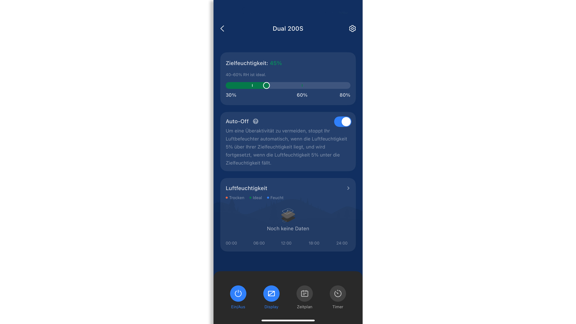 Will man einstellen, welches Feuchtelevel der Dual 200S im Modus AUTO verwirklichen soll, dann kann man dies allein in diesem Screen realisieren: So ist hier ein Slider erkennbar, in dem sich aus einer Spanne von ≈ 30 – 80 % wählen lässt, verbunden mit dem Hinweis, dass man in einem Großteil aller Situationen ein Feuchtelevel von ≈ 40 – 60 % anpeilen sollte.