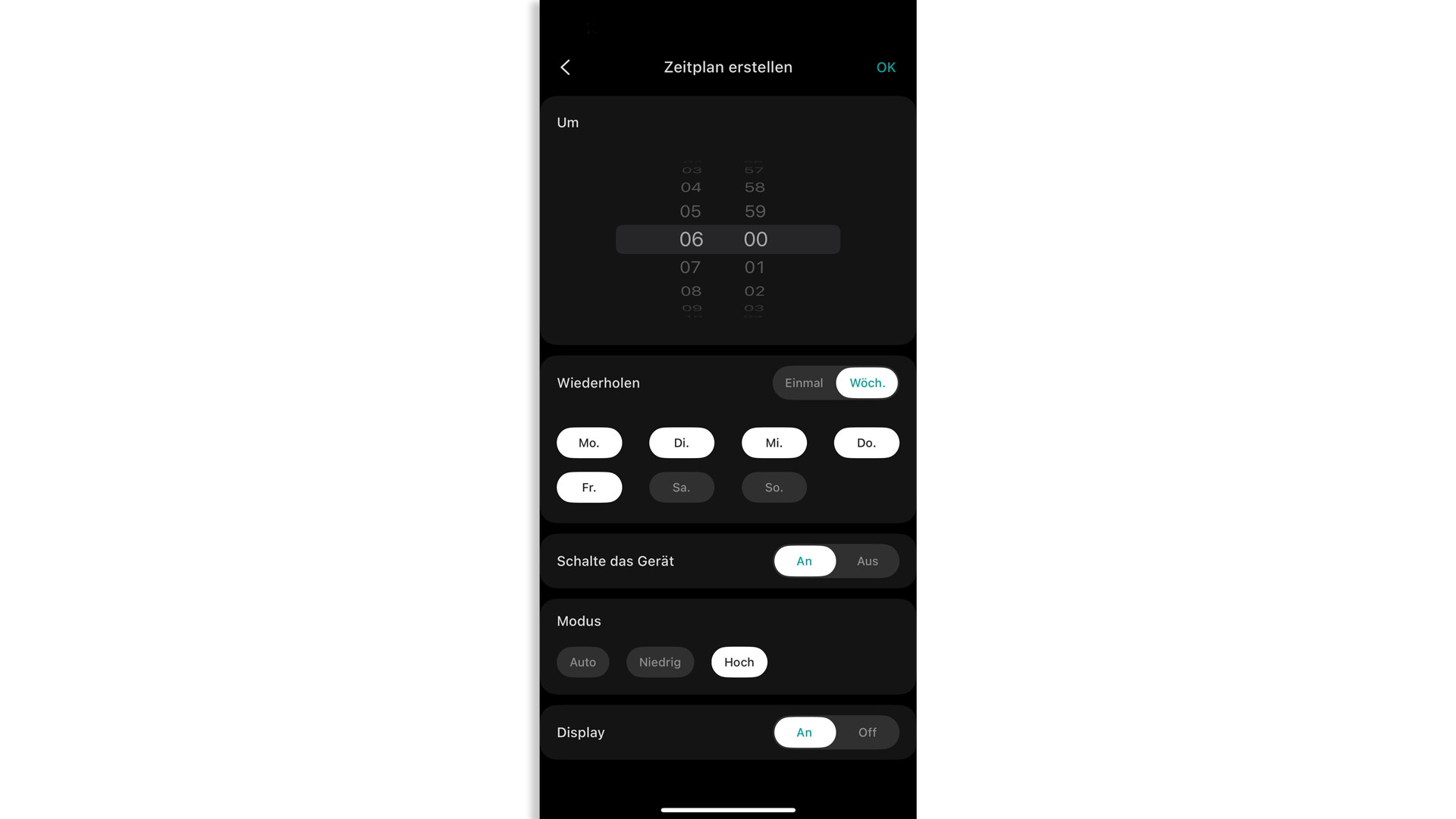 | Timer | ja, aber nur per App (1 – 24 h per Timerplan) |