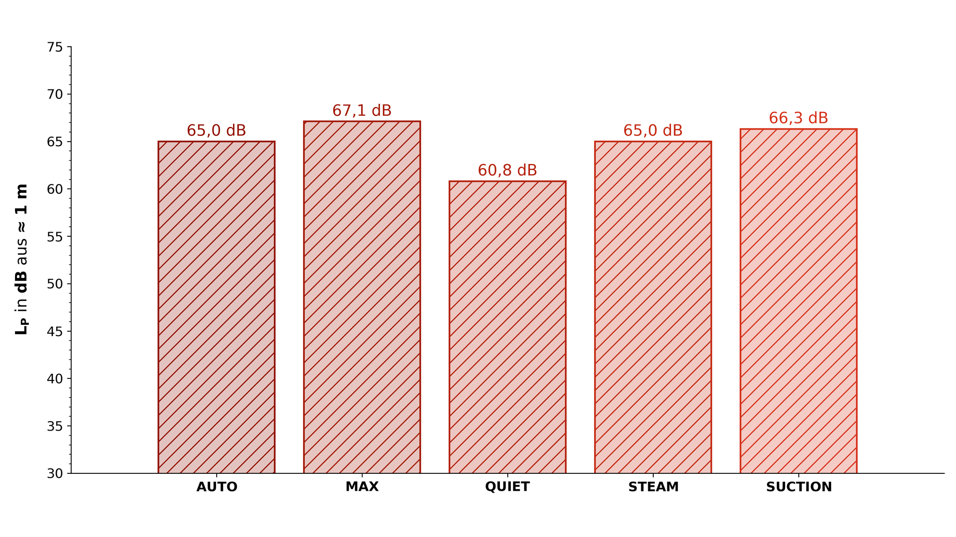 Modus AUTO: 65,0 dB; Modus MAX: 67,1 dB; Modus QUIET: 60,8 dB; Modus STEAM: 65,0 dB; Modus SUCTION: 66,3 dB |
