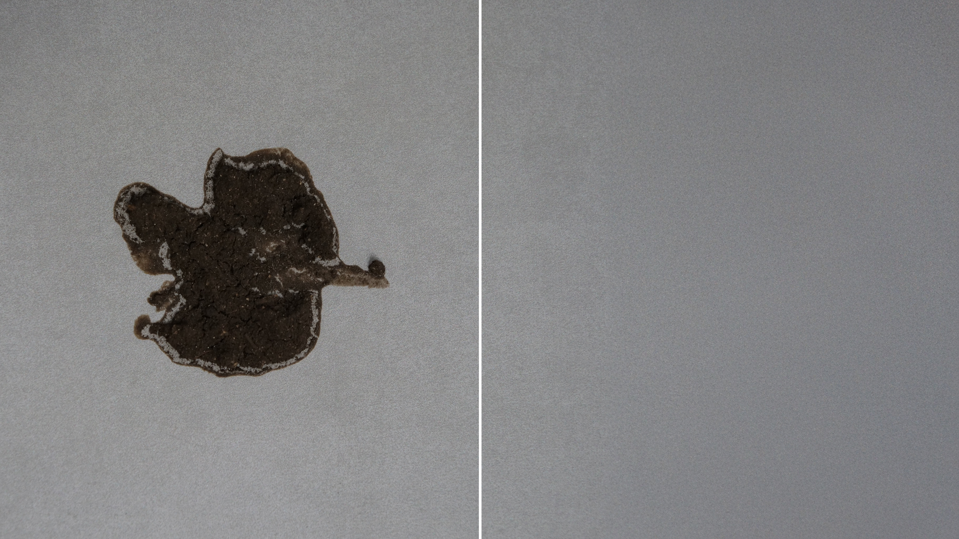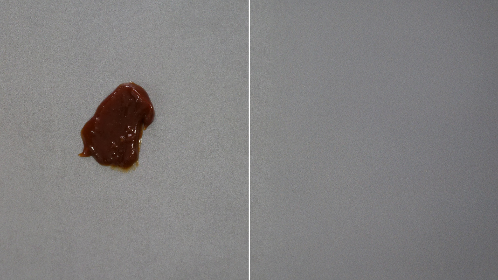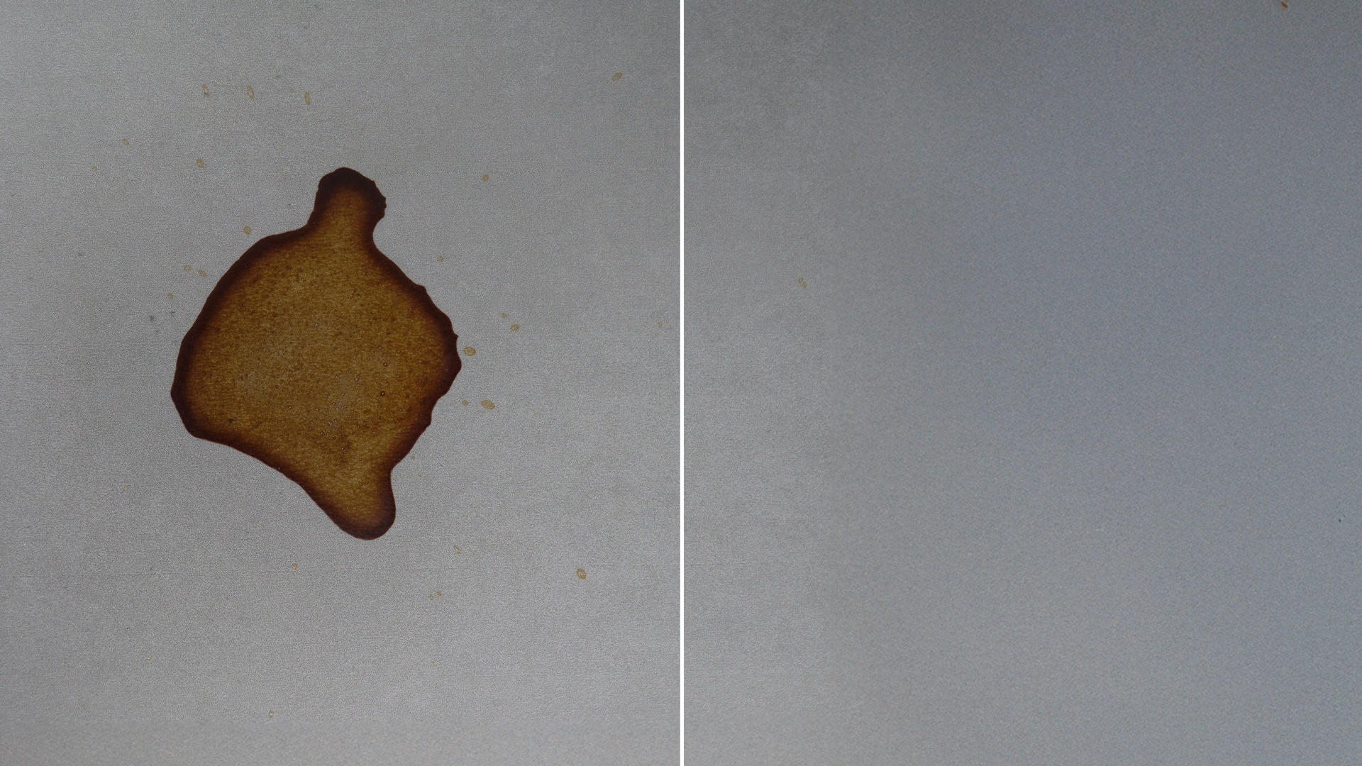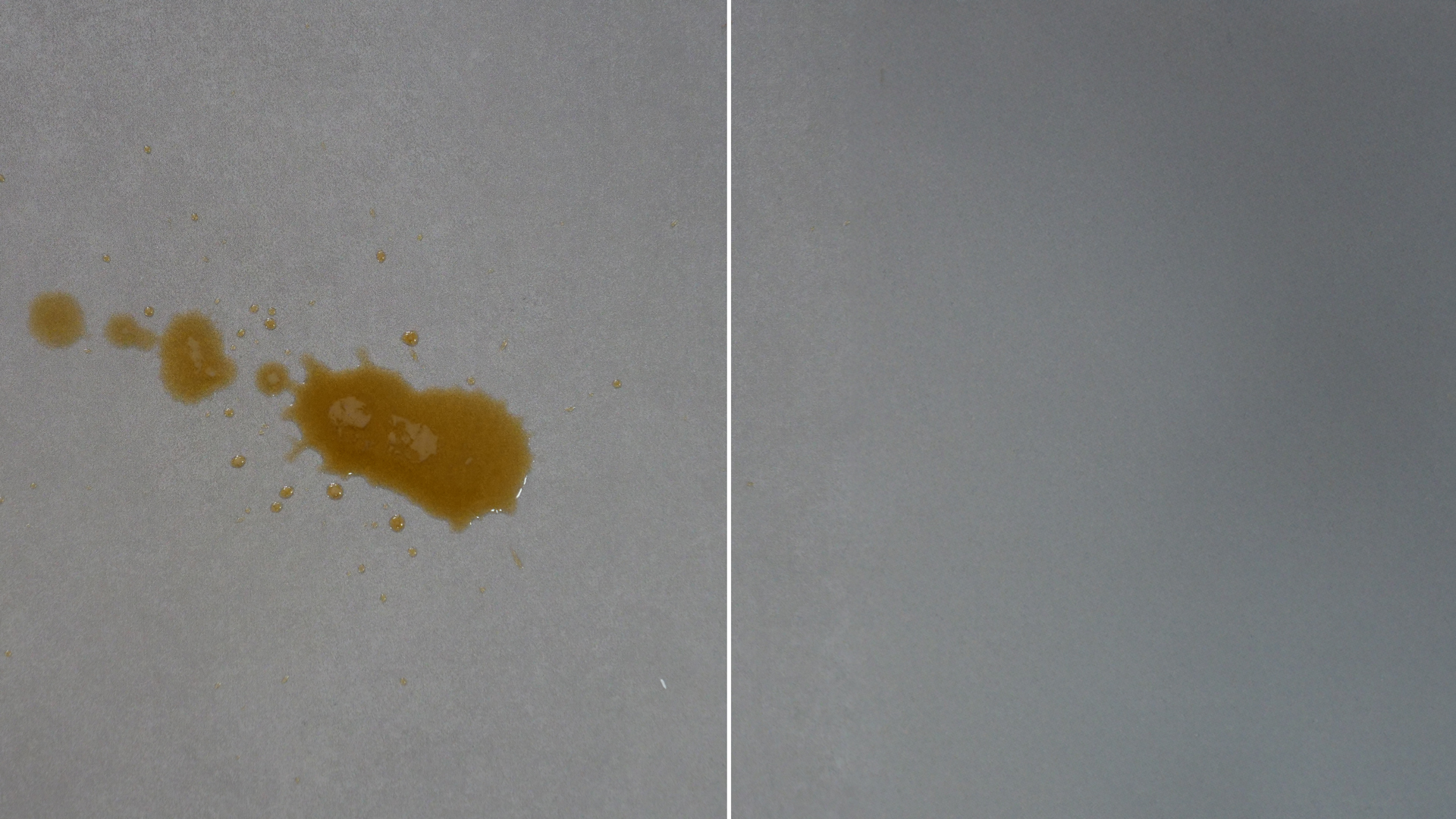 Eine wesentliche Erkenntnis, die sich während des Verwendens des Tineco FLOOR ONE S9 Artist Steam Pro erheben ließ, können wir schon einmal voranstellen: Frische Spuren von allen nur vorstellbaren Flecken kann man in vielen Fällen eilends mit dem Modell verschwinden lassen. So ließen sich ≈ 60 s nach dem Verursachen eines solchen Malheurs auch anspruchsvollere Flecken wie bspw. solche von viskosen Sirupen innerhalb von ≈ 2–4 Malen des Wischens ablösen, ohne dass sich am Ende noch Fleckenspuren erkennen ließen. Sehr viel mühevoller ist das Säubern des Fußbodens aber nach dem Trocknen von solchen Flecken: Hier kann es allemal sein, dass man die Fußbodendüse volle ≈ 3–8 Male über den Fußboden schieben muss, ehe dieser wieder in vollem Maße sauber ist. Wie wirksam das Modell in der Praxis ist, veranschaulichen wir im Weiteren anhand von mehreren Fleckenbeispielen, die wir über planem Fußboden aus 100 % Stein vorbereitet haben. Unsere Testerinnen & Tester haben das Modell in diesen Beispielen allein im Modus AUTO verwendet. Durch die Wahl des Modus STEAM aber ist das Modell vor allem dann, wenn man sich den Spuren nach dem Trocknen widmen muss, sehr viel wirksamer: Hier lösen sich viele Massen sehr viel schneller, als wenn man sich nur mit Wasser allein ans Werk machen würde.