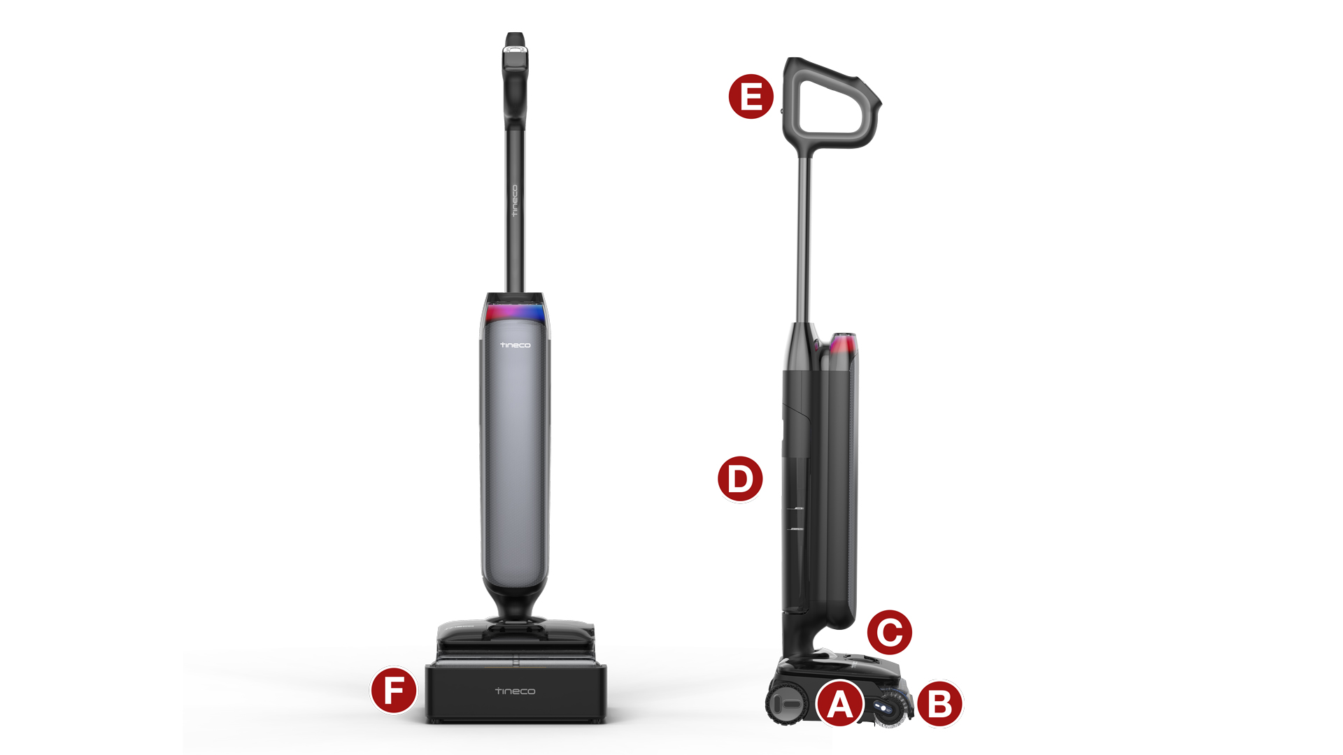 Die hier vorhandene Fußbodendüse A ist Ursprung der Fußbodenreinigungsleistung: Schließlich ist sie schon von Werk aus mit einer Walzenrolle B aus Textil versehen. Dank der andauernden Drehbewegung während der Fußbodenreinigung können Teilchen wie bspw. Erde, Gras, Sand usw. vom Fußboden im Modell verschwinden. Weil die Walzenrolle von einem sehr weichen Material ist, stellt sich die Fußbodenreinigung auch als schonend dar: Fußböden aus sensiblerem Material sollten während des Gebrauchs keinerlei Schaden erleiden. Die Fußbodendüse verteilt pausenlos Wasser über dem Fußboden, welches das Modell aus einem oberhalb der Fußbodendüse vorhandenen Tank C herausholt. Das ist sehr dankbar, denn: Ein Großteil der anderen Modelle, die wir uns schon vornahmen, kann einen solchen Tank weiter oben am Stiel vorweisen. Die Teilchen und auch das Wasser verschwinden durch die Fußbodendüse im Modell, ehe sie in einen anderen Tank D hinein wandern. Diesen kann man ohne sonderlich viel Mühe aus dem Modell herausnehmen, ihn im Weiteren ausleeren und von allen Winkeln aus mit viel Wasser ausspülen. Während der Fußbodenreinigung kann man das Modell am oberen Handteil E packen und es dank des hier vorhandenen Motors mühelos durchs Haus manövrieren. Am Handteil sind alle Tasten vorhanden, die das Anpassen von Modus & Co. erlauben: Welchen Modus man verwenden sollte, ist immer von der jeweiligen Situation abhängig. Wir stellen die Modusspanne im Weiteren noch sehr viel näher vor. Schließlich wurde dem Modell auch noch ein sehr moderner Akkumulator verliehen (Umax & Qmax: ≈ 25,2 V & ≈ 6.250 mAh): Dieser ist von Werk aus so verbunden worden, dass sich kein Wechsel vornehmen lässt. Laden wiederum kann man ihn vollkommen problemlos: Man muss das Modell bloß in die Ladestation F, die Teil des Zubehörbündels ist, stellen.
