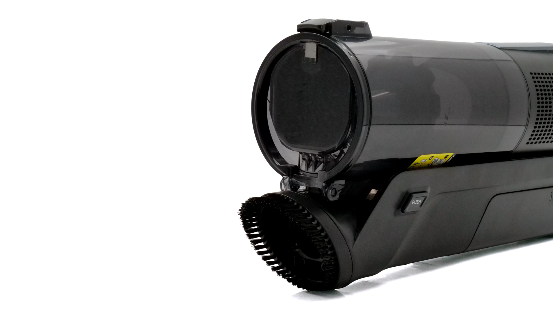 Der Staubbehälter verfügt über ein Volumen von ≈ 0,7 l und muss daher nur gelegentlich entleert werden: Er fasst so große Schmutzmengen, dass man in den meisten Fällen die Arbeit mit dem Modell nicht unterbrechen muss, weil der Behälter voll ist. An seiner Wand befindet sich eine leider manchmal nur schwer erkennbare Markierung, welche den Maximalfüllstand veranschaulicht, sodass man gleich weiß, wann eine Entleerung fällig ist. Diese erfolgt in der Regel automatisch in der Ladestation: Innerhalb von nur ≈ 25 s wird der Inhalt des Staubbehälters vollständig herausgesaugt, sodass der Akku-Staubsauger gleich wieder verwendet werden kann. Schneller und vor allem einfacher kann die Entleerung des Staubbehälters wohl kaum sein.
