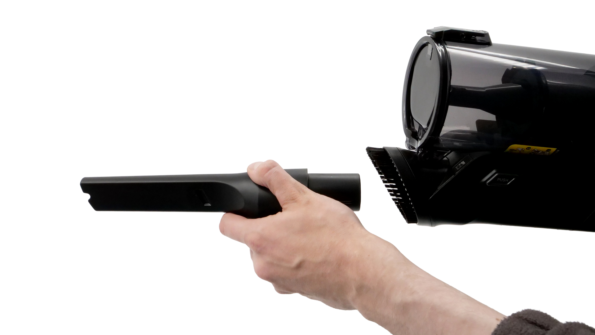 Es fällt sehr leicht, die verschiedenen Teile des Zubehörs miteinander zu verbinden oder wieder voneinander zu lösen; für beide Schritte braucht man nur etwas Kraft. Wenn man eine Düse direkt am Handteil anschließt, können die Borsten des Möbelpinsels dabei allerdings leicht störend wirken.