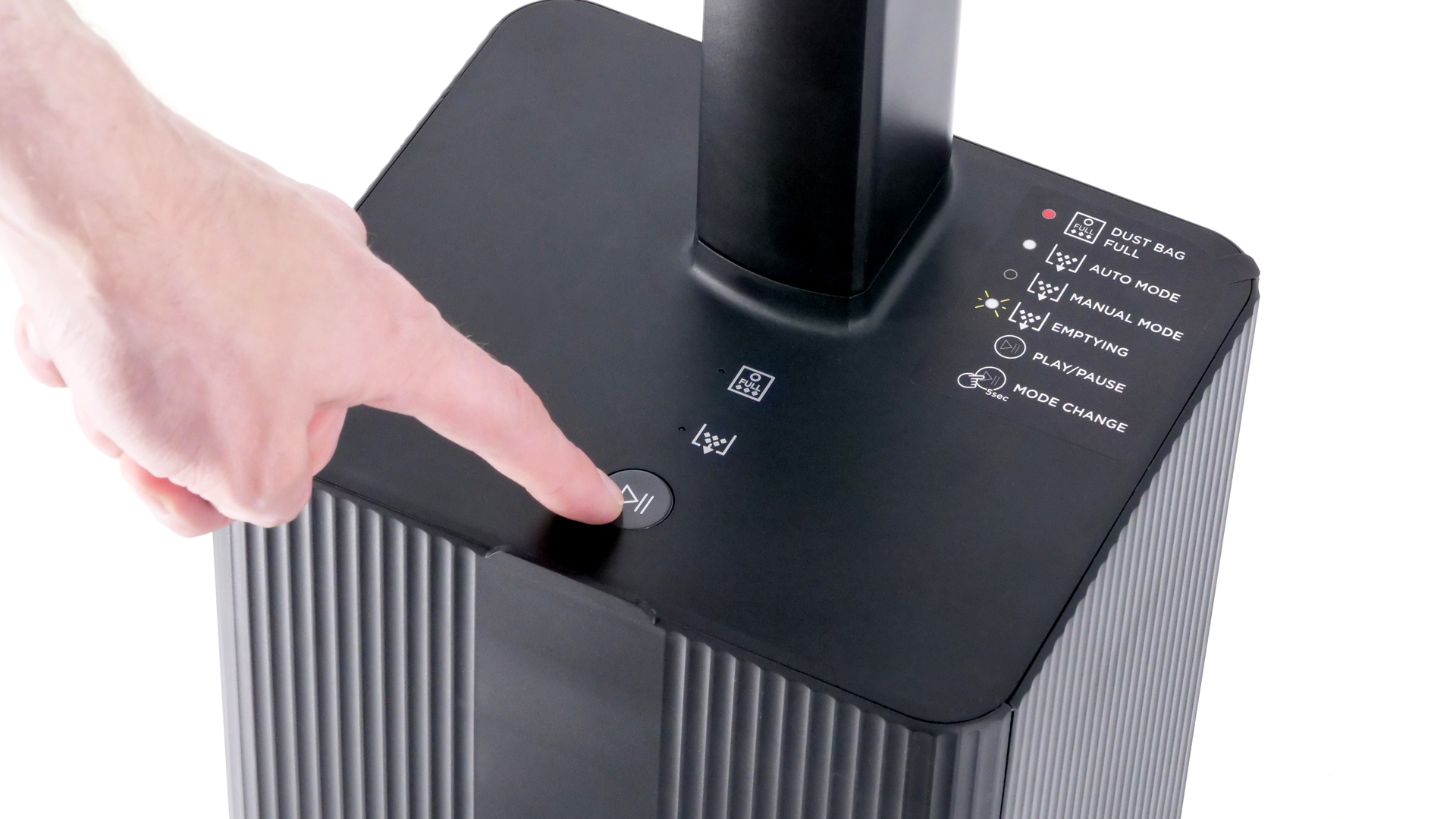 Sobald man das Modell in die Ladestation stellt, beginnt die automatische Entleerung. Dieses Verhalten lässt sich auf Wunsch jedoch ändern, sodass die Entleerung erst dann gestartet wird, wenn man die Taste an der Ladestation betätigt. Dieses Bedienelement misst ≈ 1,8 cm (⌀max d. Bedienelements); es lässt sich problemlos erreichen und betätigen. Neben ihm befinden sich zwei LEDs, welche Statusmeldungen veranschaulichen; eine gut verständliche Legende erläutert die Bedeutung der einzelnen Leuchtsignale sowie die Funktion der Taste.