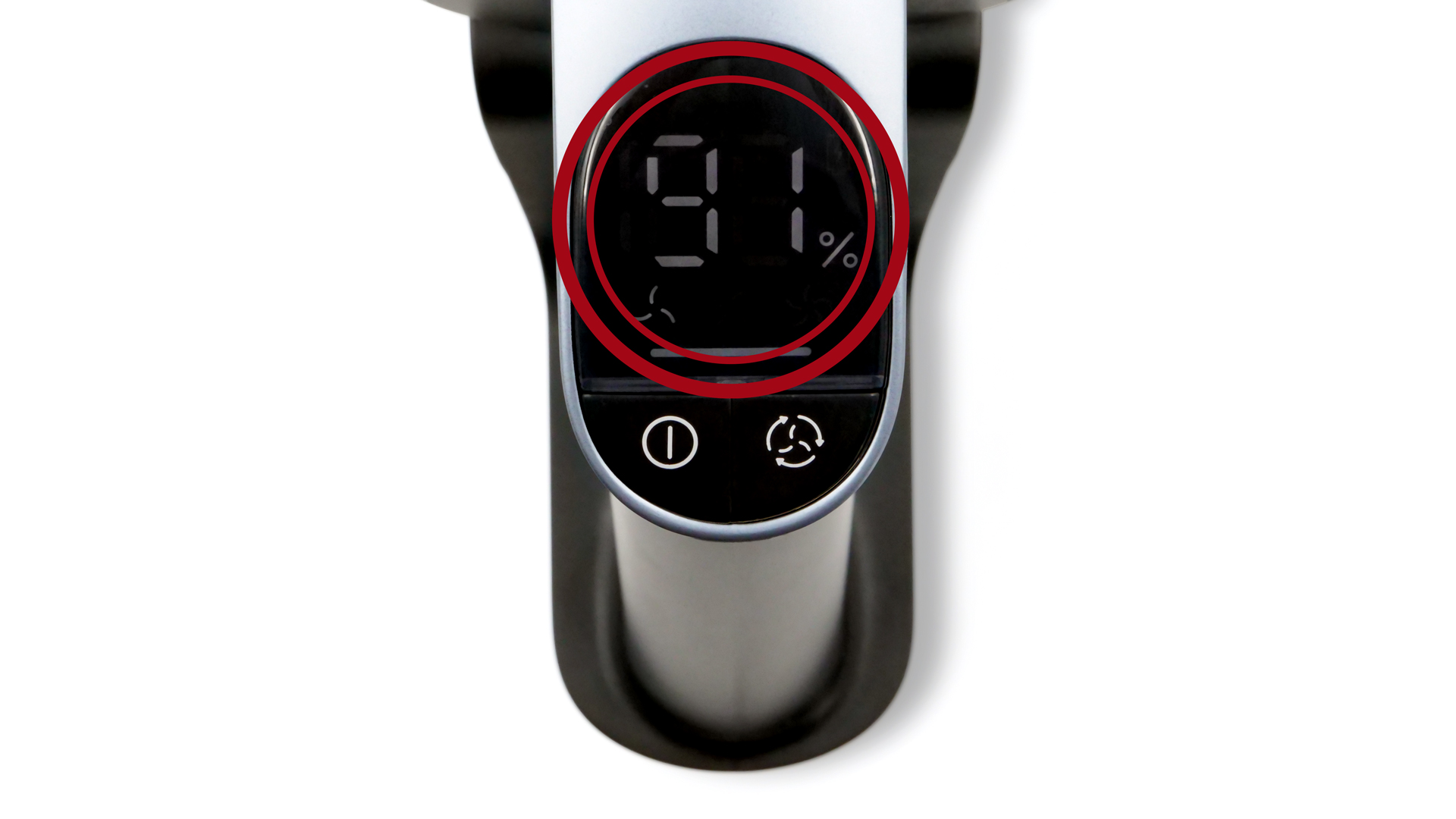 Das ≈ 3,4 × 3,7 cm (Bmax × Hmax d. Bildschirms) messende Display lässt sich bei allen Lichtverhältnissen gut ablesen; es ist so am Handteil platziert, dass man es jederzeit unmittelbar einsehen kann. Hier wird zunächst der Ladestand des Akkus verdeutlicht, und zwar sehr präzise in Prozent: Dadurch erfährt man exakt, wie es im jeweiligen Moment um den Akku bestellt ist, und kann in etwa abschätzen, wie lange sich mit der Ladung noch arbeiten lässt. Kurz bevor der Akku leer ist, erscheint zusätzlich ein blinkendes Symbol, welches darauf hinweist, dass man bald mit dem Aufladen beginnen sollte. Auch der gerade aktive Modus wird im Display angezeigt, wenn auch nur anhand eines Symbols; dieses ist immerhin problemlos verständlich.