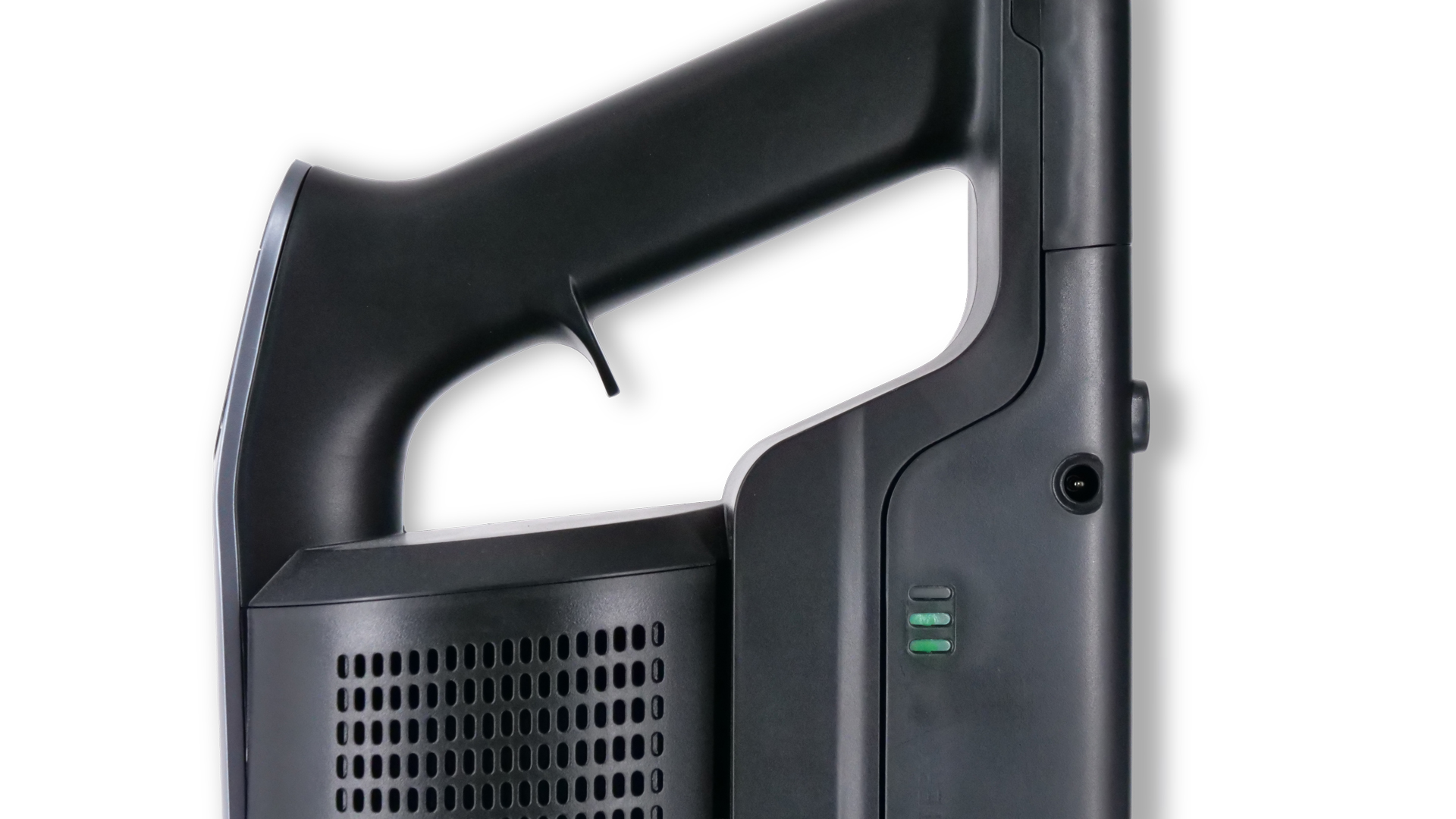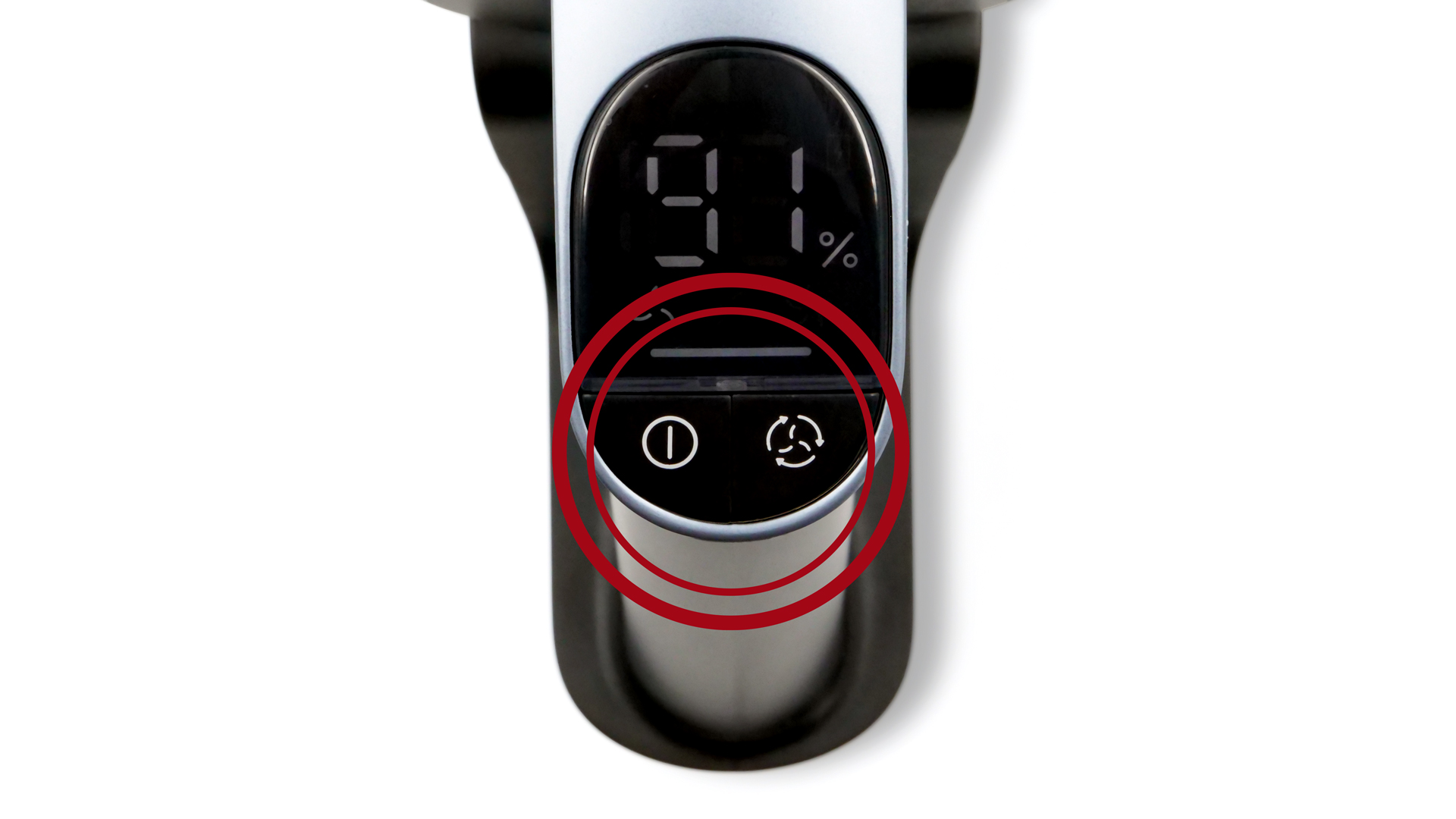 Am Handteil des Modells befinden sich zwei Bedienelemente. Sie wurden so platziert, dass man sie mühelos mit den Fingern erreichen kann; aufgrund ihrer Maße (≈ 1,5 × 1,6 cm, Lmax × Bmax d. Bedienelemente) sowie ihres tadellosen Druckpunkts fällt ihre Betätigung einfach. Die eine Taste dient, wie ihre Beschriftung unmittelbar verständlich macht, dazu, den Akku-Staubsauger an- und wieder auszuschalten. Das Symbol auf der anderen Taste ist hingegen nicht so eindeutig: Über sie stellt man allerdings schlichtweg den Modus ein.