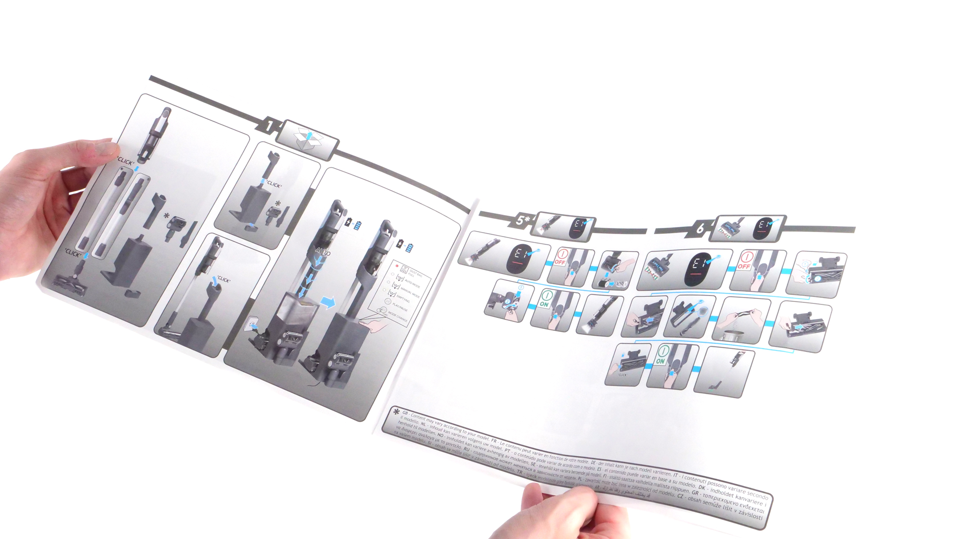 Dass die Bedienungsanleitung nahezu vollständig aus Graphiken besteht, erschwert das Verständnis ein wenig: Zusätzliche Hinweise in Schriftform könnten manche Dinge nämlich noch anschaulicher erläutern. Immerhin sind die Graphiken trotz ihrer zum Teil geringen Größe sehr gelungen: Dank ihrer hochwertigen Gestaltung erkennt man den Inhalt unmittelbar. Die Unübersichtlichkeit der Anleitung und das Fehlen von erklärenden Texten haben in der Praxis aber keine ernsthaften Auswirkungen: Der Umgang mit dem Akku-Staubsauger gestaltet sich ja so intuitiv, dass man nur vereinzelt einen Blick in die Dokumentation werfen muss.