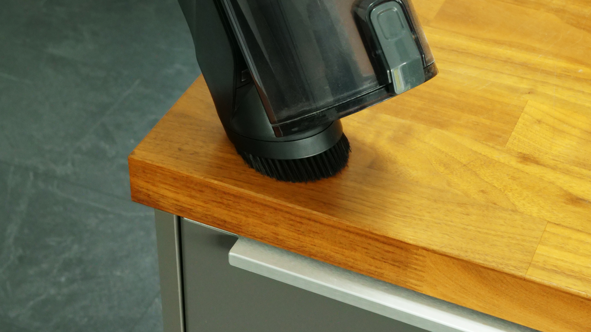 Die Reinigungsleistung des Modells hat uns positiv überrascht: Es reinigt Fußböden aller Art so gründlich wie nur wenige andere Akku-Staubsauger, die wir in der Vergangenheit getestet haben. Bei Hartböden genügt schon der schwächste Modus ECO, um mit einer Saugbewegung ≈ 96,8 % aller Verschmutzungen aufzusaugen. Dabei macht es keinen Unterschied, welche Größe die einzelnen Schmutzpartikel haben; alles wird beinahe gleichermaßen gut beseitigt.