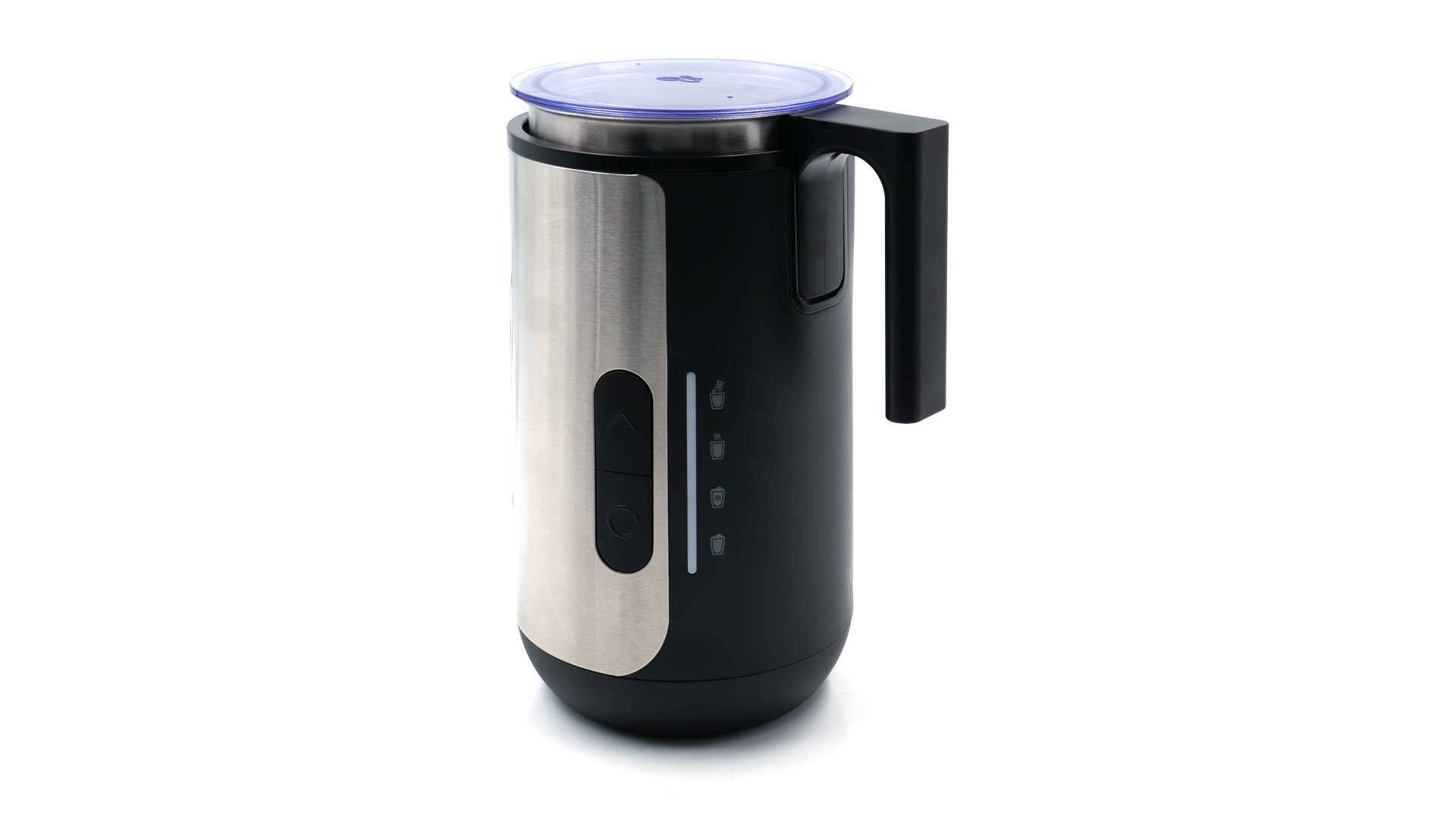 Der Induktions-Milchaufschäumer ist gegenüber ähnlichen Modellen verhältnismäßig groß (≈ 16,0 × 11,5 × 21,0 cm, Bmax × Tmax × Hmax d. Modells) und schwer (≈ 1,3 kg, mmax d. Modells, leer), lässt sich allerdings ohne jegliche Anstrengung verwenden. Mit dem Korpus des Milchaufschäumers ist ein ≈ 0,8 m langes Stromkabel verknüpft, sodass man den Induktions-Milchaufschäumer nicht notwendig unmittelbar neben einem Stromanschluss aufstellen muss.