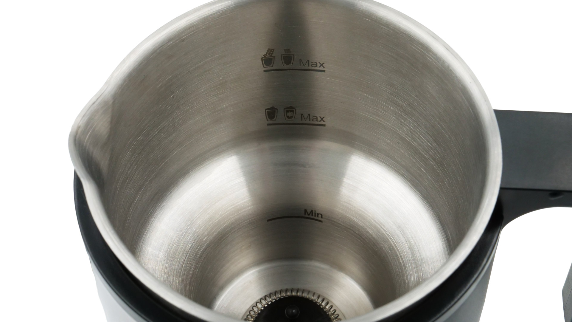 Dem Milchbehälter wurde eine sehr simple Skala von eingängigem Stil verliehen, die sich dank ihrer schwarzen Farbgestaltung großartig von der silbernen Wand des Milchaufschäumers abheben kann. Die hier gegebenen Markierungen stellen dar, wie viel Milch man mindestens und maximal in den Milchaufschäumer füllen darf – abhängig vom jeweils einschlägigen Modus. Monieren ließe sich bloß Eines: Die Skala ist nur einseitig gegeben und daher exzellent einsehbar, wenn das Modell mit der rechten Hand abgestellt wird, nicht allerdings, wenn es mit der linken Hand abgestellt wird. Hier empföhle sich eine beidseitige Skala, um Links- und Rechtshänderinnen & -händern gleichermaßen zupasszukommen.