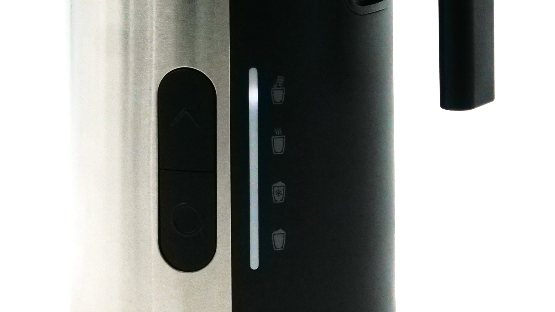 Die Wahl des Modus erfolgt über die oben gelegene Taste, während sich über die unten gelegene Taste der Betrieb starten bzw. stoppen lässt; nach dem Beginn eines Aufschäum- oder Aufwärmvorgangs blinkt das neben der einschlägigen Modusgraphik befindliche Licht, ehe es nach dessen Beendigung fortlaufend leuchtet.