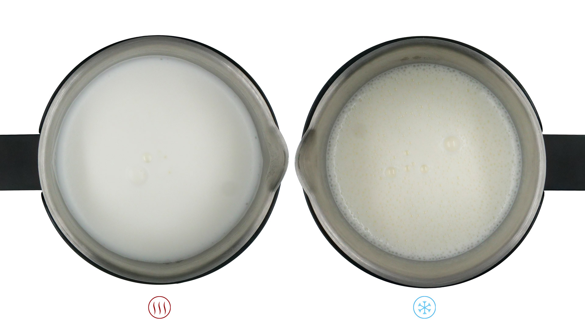 Der Milchaufschäumer kann frische Vollmilch großartig aufschäumen: Die Beschaffenheit des Milchschaums ist exzellent, vor allem weil er größtenteils feinporig ist; übrigens ist es in Bezug auf die am Ende erreichte Qualität beinahe gleichgültig, ob das Aufschäumen nun kalt oder warm erfolgt. Wird Milch mit einer ursprünglichen Temperatur von ≈ 8 °C aufgeschäumt, erreicht sie am Ende des Aufschäumvorgangs eine solche von ≈ 11,3 °C (beim kalten Aufschäumen) bzw. ≈ 76,1 °C (beim warmen Aufschäumen); Letzteres ist ein bisschen zu hoch.