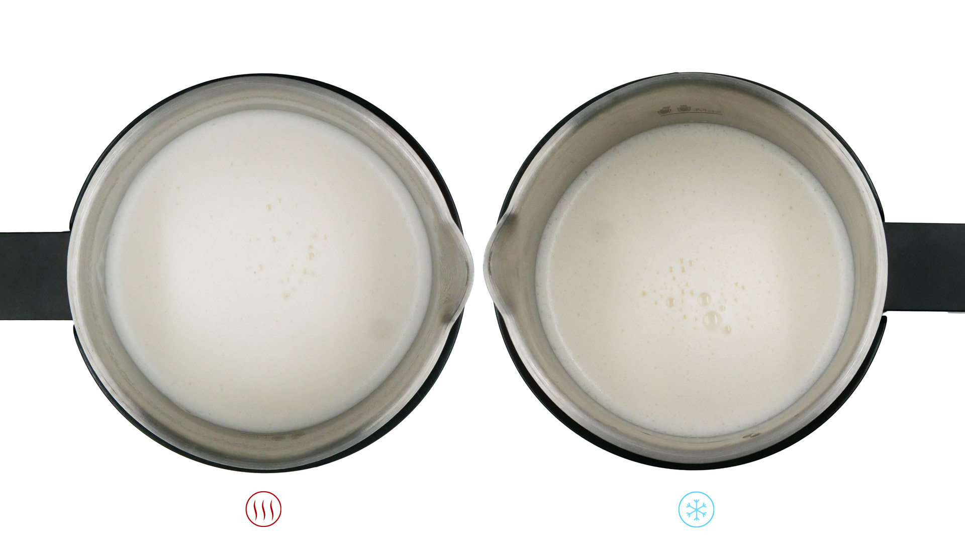 ≈ 120 ml Vollmilch werden sehr zügig aufgeschäumt: Wir maßen eine eindrucksvolle Geschwindigkeit von ≈ 0:58 min beim kalten Aufschäumen und von ≈ 2:04 min beim warmen Aufschäumen. Übrigens: Während die Temperatur beim kalten Aufschäumen nur sehr geringfügig ansteigt (≈ 11,3 °C), werden Milch und Milchschaum beim warmen Aufschäumen sehr heiß (≈ 76,1 °C); auch wenn hier eine geringere Temperatur wünschenswert wäre, ließen sich von uns doch keine Beeinträchtigungen in Bezug auf das Geschmacksprofil erkennen.