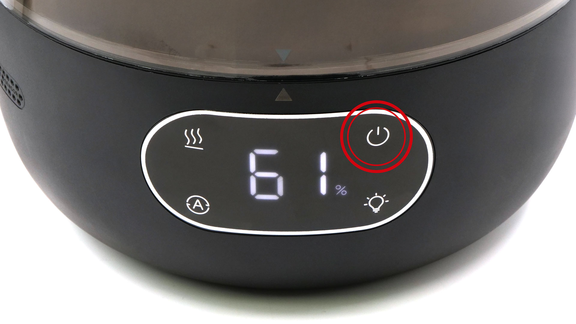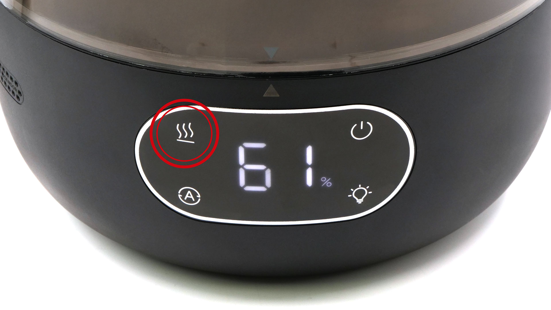 Gebrauchen ließ sich das Modell von unseren Testerinnen & Testern ohne sonderlich viel Mühe, auch wenn an dem vorderen Touchpanel nur ein paar anschauliche Graphiken vorhanden sind, die sich in ihrem Grau in einem noch ausreichenden Maße vom Schwarz des Touchpanels abheben. Das Touchpanel als solches ist aber mühelos erreichbar und von einer soliden Qualität, was sich vor allem am verlässlichen Ansprechverhalten erkennen ließ. Oberhalb des Touchpanels ist ein Screen vorhanden, der auch den aktuellen Modus veranschaulicht. Dies ist auch wesentlich: Schließlich ist es der Modus, durch dessen Wahl man verändern kann, wie viel Wasser das Modell in Aerosol verwandeln soll. Dies lässt sich im Modus MANUAL nach Wunsch anpassen, während das Modell im Modus AUTO alles von allein verwirklichen kann. Was sich monieren ließe: Dass dem Gebrauch nicht per App nachgegangen werden kann (➞ Die Bedienung).