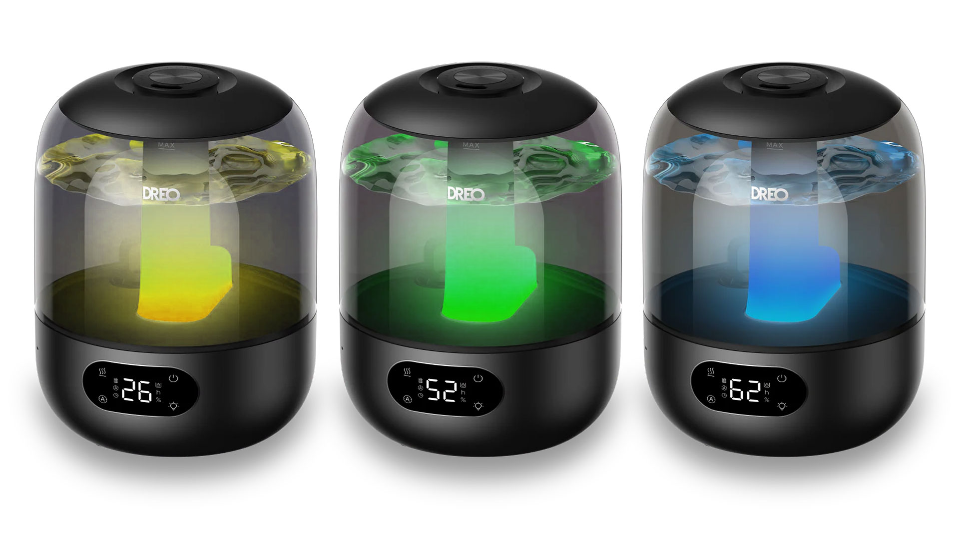 Der opak-weiße Teil innerhalb des Tanks des Modells kann in einem von dreierlei verschiedenen Tönen nach außen hin scheinen. Dieser Ton veranschaulicht das aktuelle Humiditätslevel im Haus: So soll Gelb ein Humiditätslevel von ≤ 30 %, (Bild, s. l.), Grün ein solches von 31 – 60 % (Bild, s. M.) und Blau ein solches von ≥ 61 % (Bild, s. r.) abbilden.