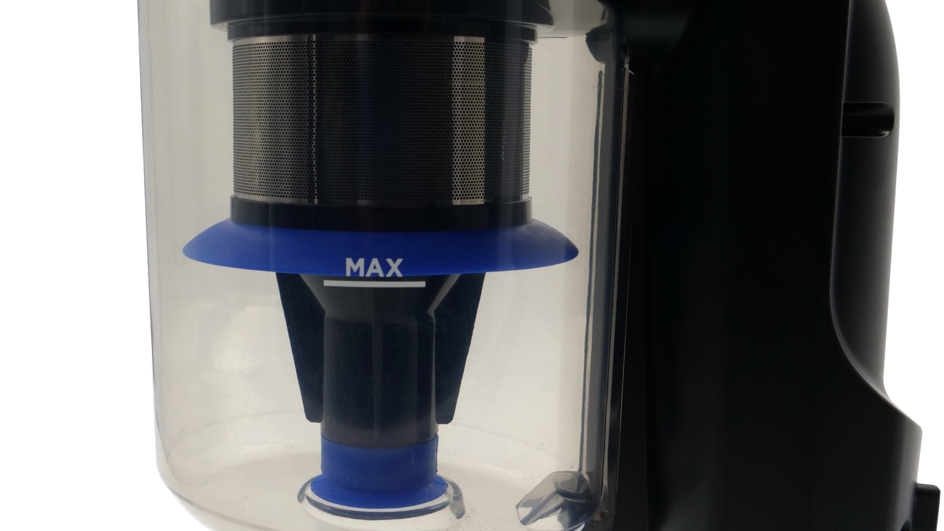 Diese gut sichtbare, aber leider nur an einer Stelle des Staubbehälters angebrachte Markierung stellt den Maximalfüllstand dar, sodass man gleich weiß, wann eine Entleerung spätestens fällig wird. Meist wird man die Fußbodenreinigung nicht mittendrin unterbrechen müssen, um sie vorzunehmen: Der Behälter fasst nämlich bis zu ≈ 0,55 l, was in der Regel ausreichen sollte, um alle Reinigungsarbeiten in einem Durchgang vorzunehmen.