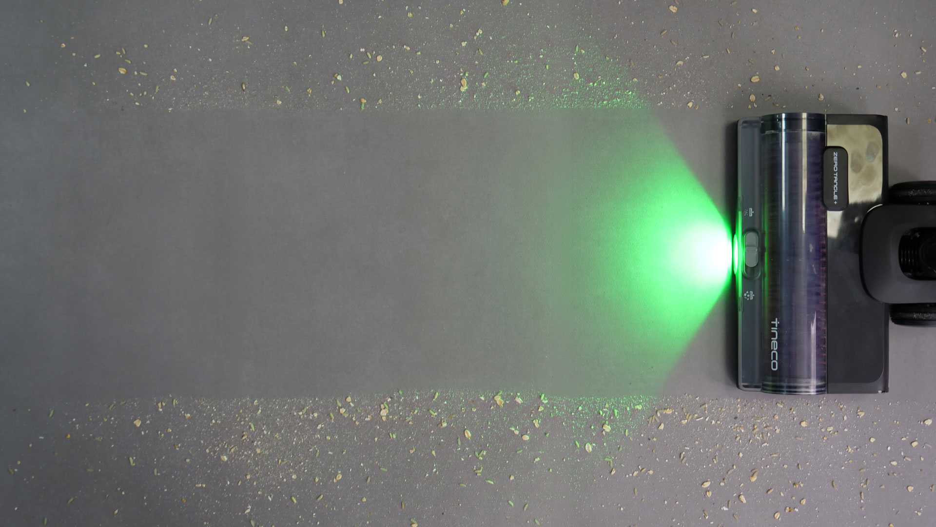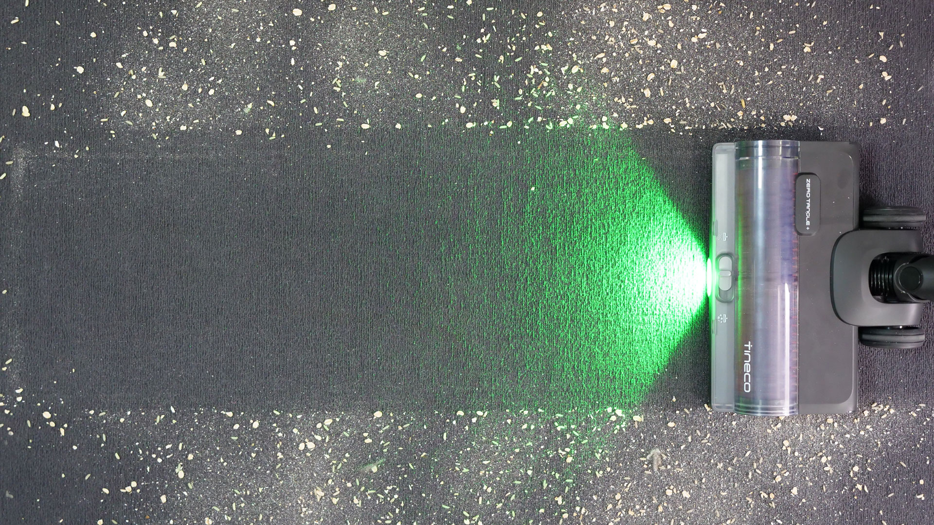 Die LEDs an der Fußbodendüse erhellen den Bereich vor ihnen mit einem hellgrünem Licht; dadurch lassen sich auch kleinste Schmutzpartikel häufig überraschend gut erkennen und anschließend großflächig beseitigen.