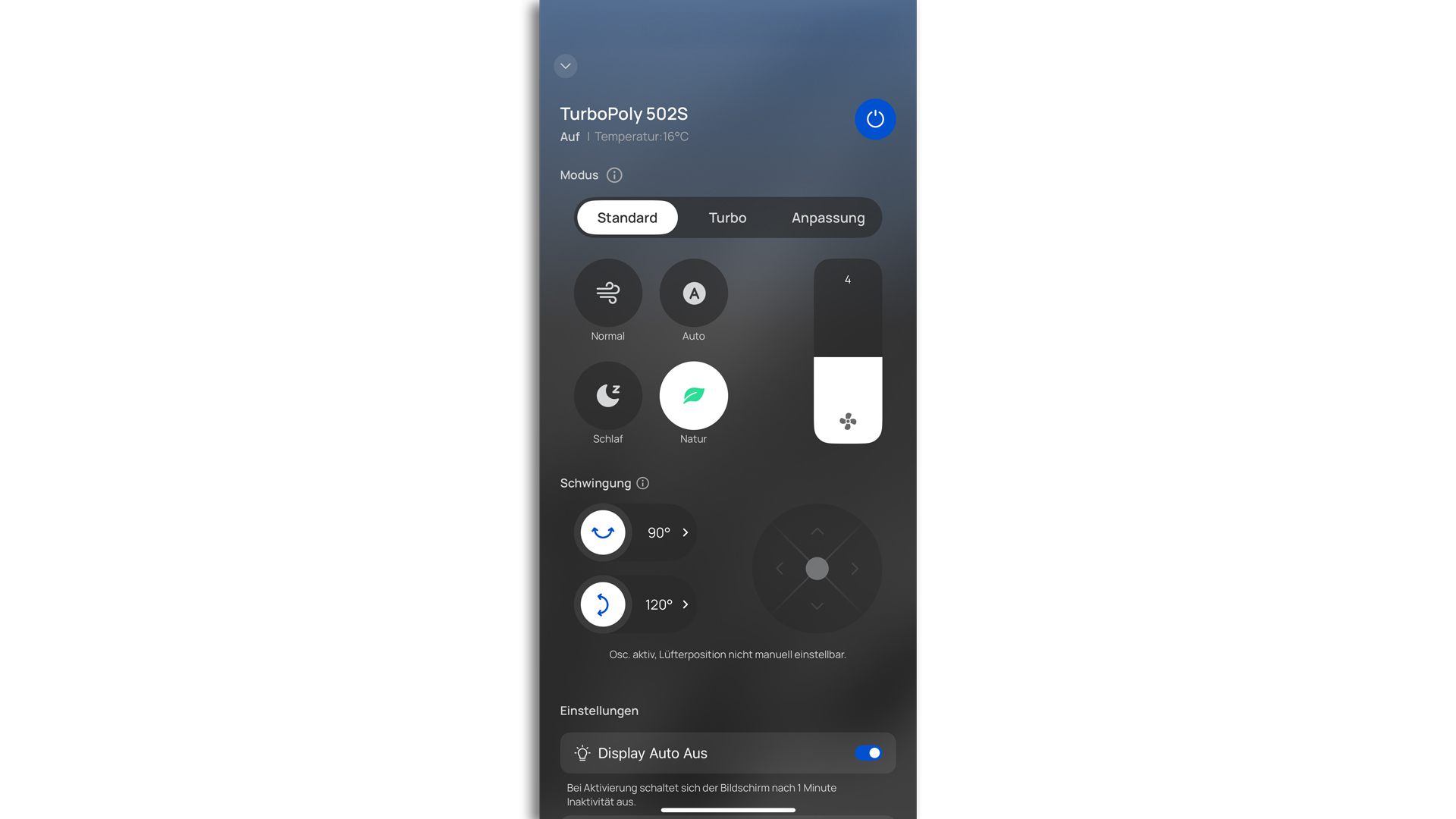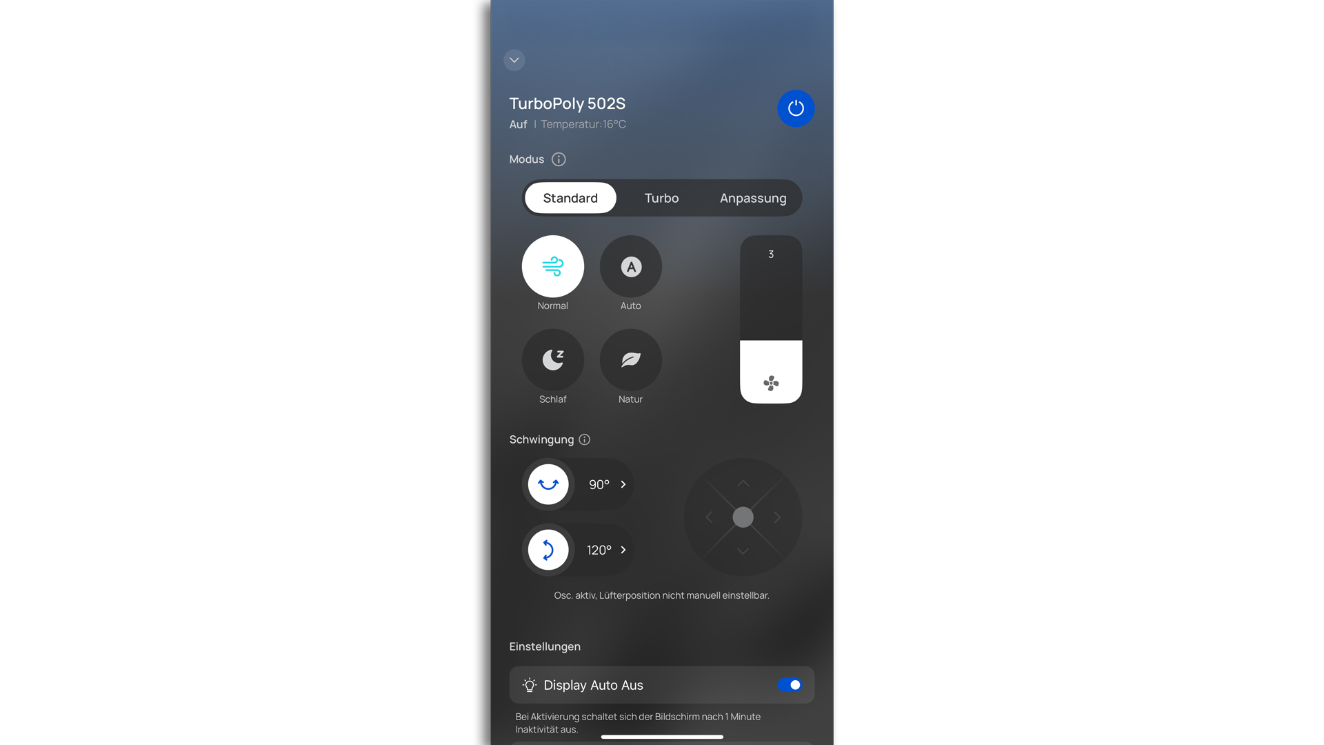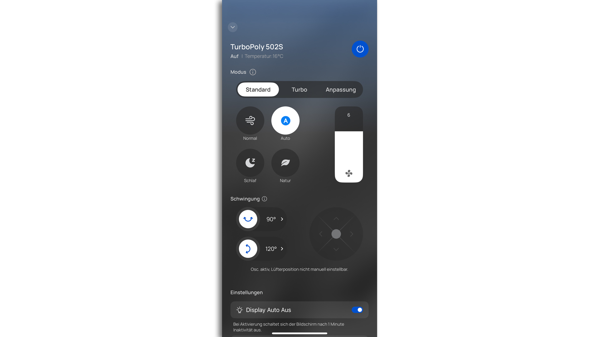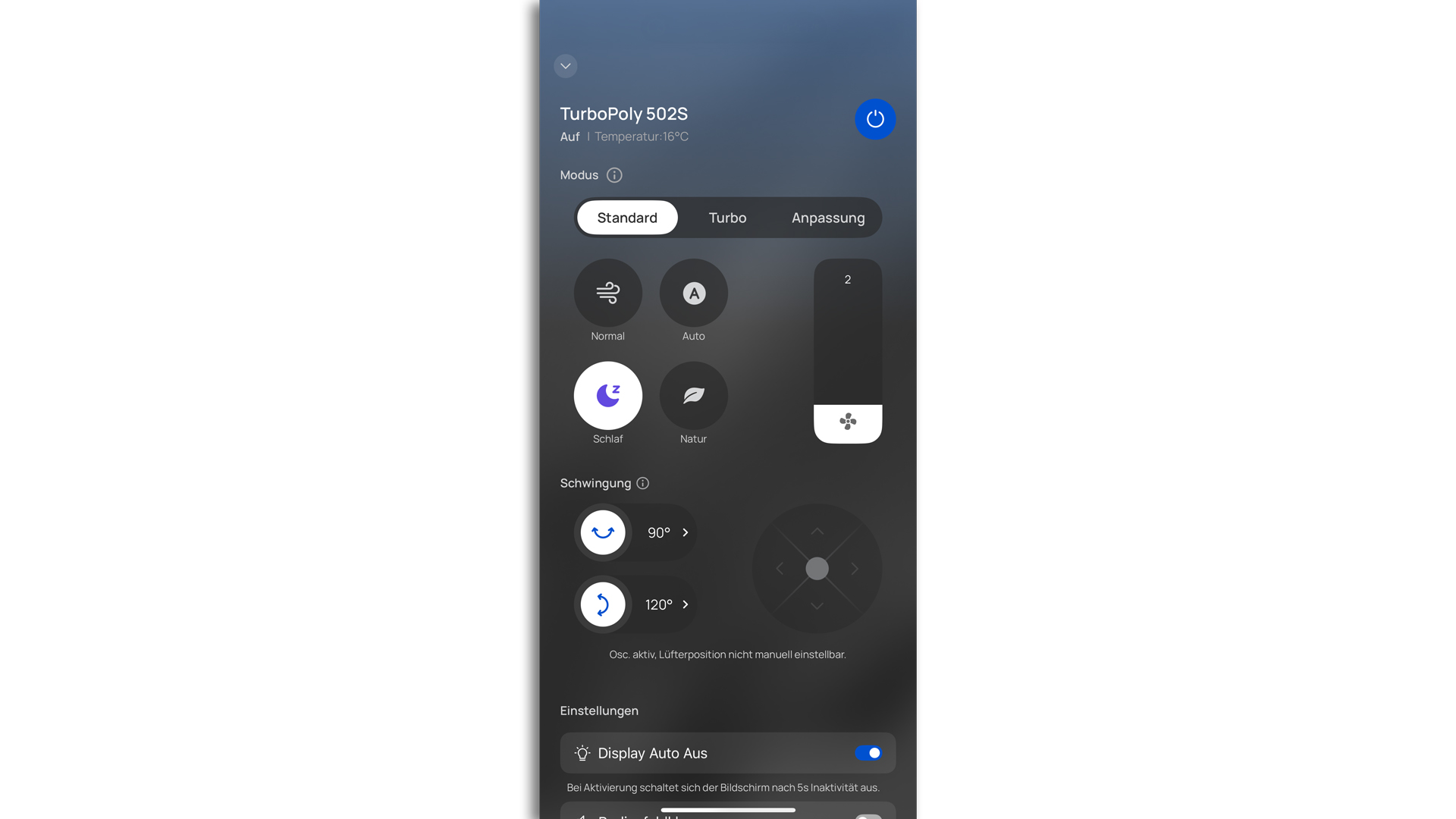 Dank spezieller Sensoren kann der TurboPoly 502S andauernd erkennen, welche Temperaturen im Wohnraum vorherrschen, und das Windmaß, also das Tempo des Ventilators, im Weiteren an diese Temperaturen anpassen. So kann man sich immer eines passenden Windstoßes sicher sein, ohne dass man das Winlevel von Hand verändern muss. Wird es also bspw. während des Verwendens dieses Modus in erheblichem Maße wärmer, so stellt das Modell auch ein erheblicheres Windlevel ein. Wir nahmen den Modus AUTO, weil das Modell in ihm alles Wesentliche von allein verwirklichen kann, als eine enorme Annehmlichkeit wahr.