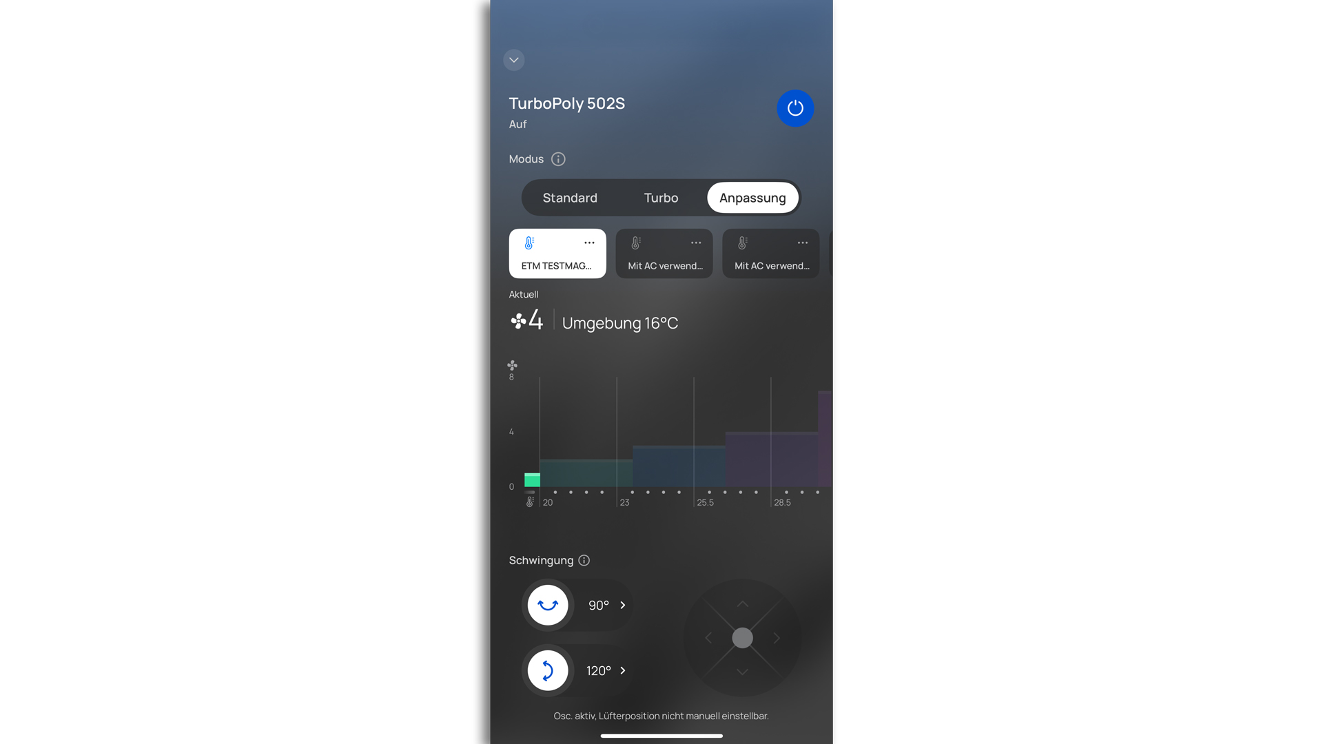 Der Modus CUSTOM ist dem Modus AUTO darin ähnlich, dass das Modell den Wechsel des Windlevels auch in diesem Modus von allein vornehmen kann. Was also ist nunmehr anders? Dass man in der App sehr präzise voreinstellen kann, ab welchen Temperaturen der Ventilator welches Windlevel wählen soll – im Modus CUSTOM lassen sich diese Temperaturschwellen also vollkommen personalisieren.
