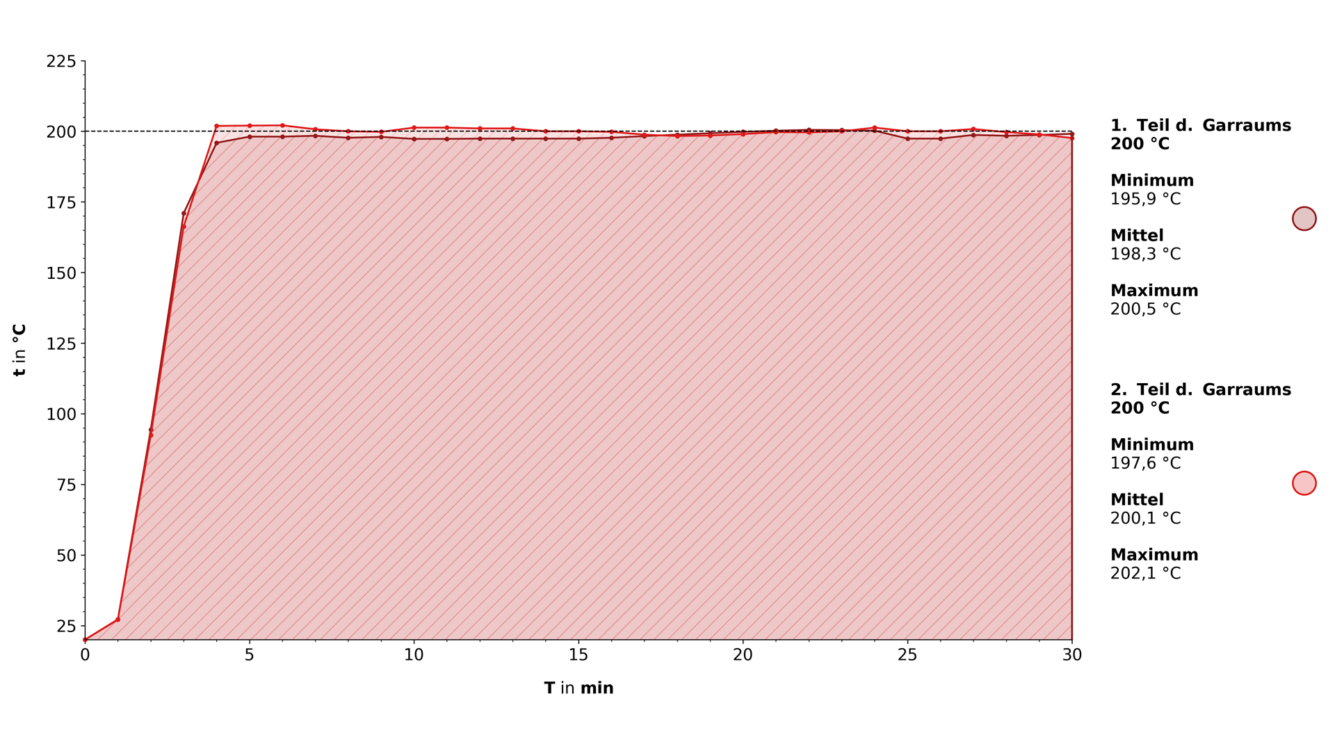 Die sehr solide Qualität der Technik kann man bspw. auch daran erkennen, dass sich in den beiden Teilen des Garraums verschiedene Temperaturen verwenden lassen, ohne dass die Temperatur in dem einen Teil des Garraums in die Temperatur in dem anderen Teil des Garraums einspielen würde. Gerade dann, wenn man auch eine sensiblere Speise servieren will, ist dies von enormem Vorteil. Man stelle sich bspw. vor, dass man in dem einen Teil des Garraums eine Speise aus Fleisch oder Fisch bei einer Temperatur von ≈ 200 °C und in dem anderen Teil des Garraums Mini-Cheese-Cakes, -Lava-Cakes usw. bei einer Temperatur von ≈ 120 °C in wundervoll-süße Genusserlebnisse verwandeln will, ohne dass sie verbrennen. Das lässt sich, wie man anhand des Graphen der Temperaturen erkennen kann, problemlos realisieren.