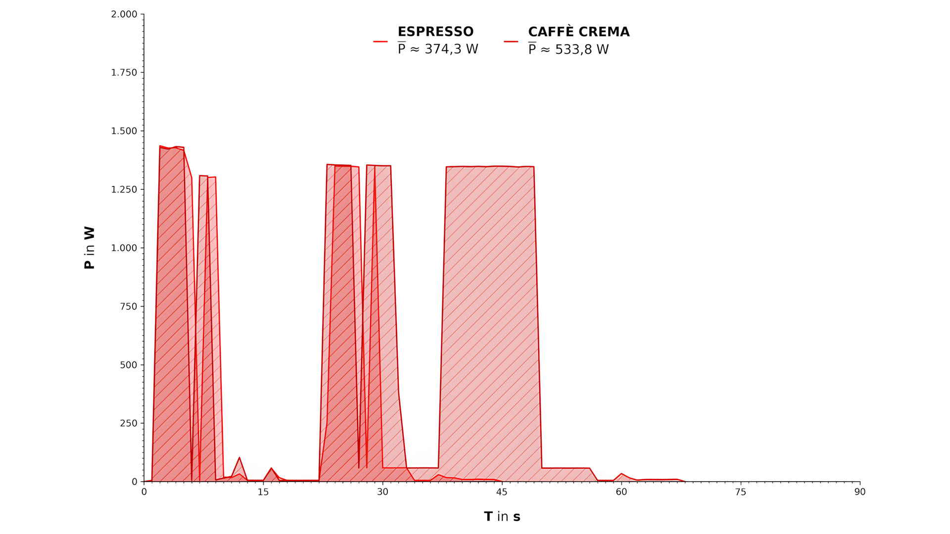 ESPRESSO: 373,3 bzw. 1.436,1 W; CAFFÈ CREMA: 533,8 bzw. 1.432,5 W; CAFFÈ CREMA XL: 592,7 bzw. 1.432,8 W |