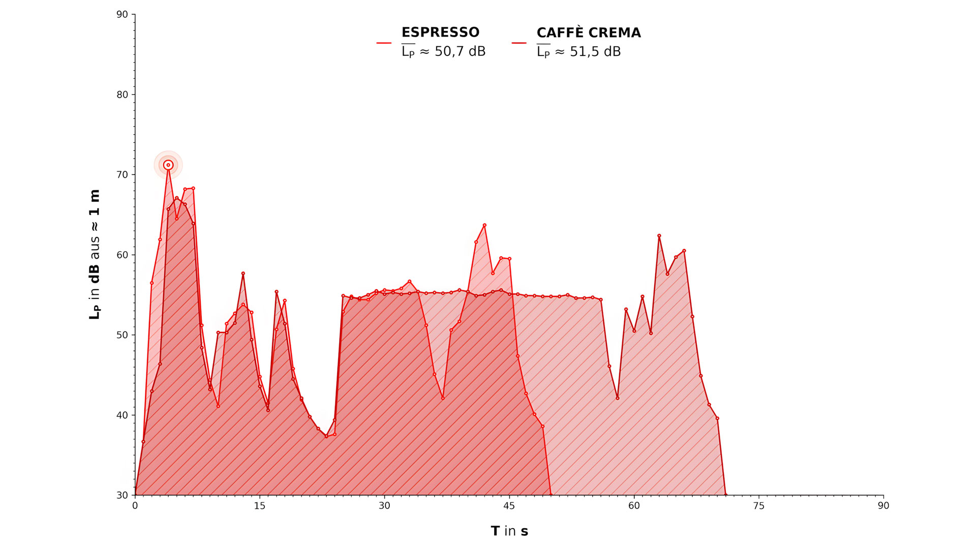 Der Schalldruckpegel, der von dem Kaffeevollautomaten während des Bezugs einer Kaffeespezialität ausgegeben wird, ist durchweg gering: Wir maßen bspw. während des Bezugs eines Espressos einen solchen von nur ≈ 50,7 dB, wobei sich eingangs des Bezugsvorgangs ein erheblicherer Schallpeak von ≈ 71,2 dB verzeichnen ließ. Der Schalldruckpegel während des Bezugs eines Caffè Cremas ist dem sehr gleichartig, gleichgültig übrigens wie es sich mit der Größe dieser Kaffeespezialität verhält: Hier maßen wir einen Schalldruckpegel von ≈ 51,5 dB bzw. ≈ 52,4 dB, verknüpft mit gelegentlichen Schallpeaks von ≈ 67,1 dB. Diese Schallpeaks allerdings sind, weil sie jeweils nur ≈ 1 s währen, eher nebenrangig. Sehr verwundert waren wir über das hier gegebene Mahlwerk: Schließlich ist die mit dem Mahlvorgang verknüpfte Klangfarbe nicht hell, sondern vielmehr dunkel, was von vielen Menschen als sehr viel angenehmer empfunden wird.