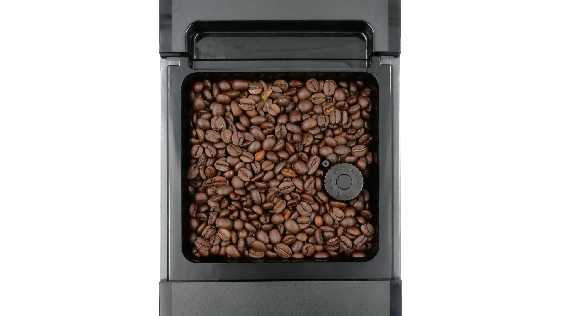 Der oben befindliche Kaffeebohnenbehälter ist leichtgängig erreichbar und von einer durchweg passablen Größe: Schließlich kann man max. ≈ 150 g Kaffeebohnen in ihn einfüllen. Während des Bezugs eines Espressos gelangen ≈ 4,4 – 9,8 g Kaffeebohnen ins Mahlwerk, sodass sich ≈ 15 – 34 Espressi beziehen lassen, ehe der Kaffeebohnenbehälter erschöpft ist. Dieser lässt sich per Dichtungsprofil so sicher verschließen, dass die Kaffeebohnen auch bei längerfristiger Lagerung nur geringfügig an Aroma verlieren. Eine Öffnung, mithilfe derer sich alternativ auch Kaffeepulver verwenden ließe, ist leider nicht gegeben; das ist vor allem dann schade, wenn man bspw. abends regelmäßig noch eine koffeinfreie Kaffeespezialität genießen will.