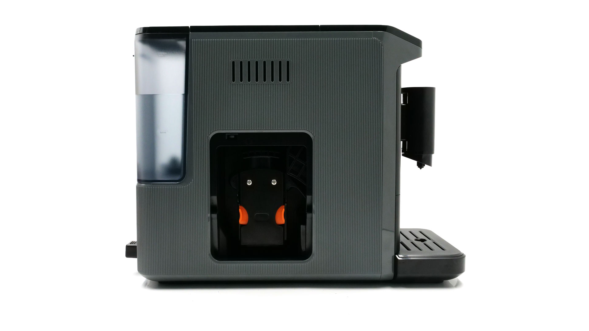 Der rückseitig gelegene Tank ist sehr leichtgängig zu handhaben und kann mit ≈ 1,1 l Wasser befüllt werden; es reicht also regelmäßig aus, den Tank bloß morgens einmal mit neuem Wasser zu versehen, um ganztägig Kaffeespezialitäten beziehen zu können. Ähnlich verhält es sich mit dem Kaffeepuckbehälter: Dieser kann neun Kaffeepucks aufnehmen, ehe seine Kapazität erschöpft ist; infolgedessen wird man ihn regelmäßig nur einmal abends leeren müssen.