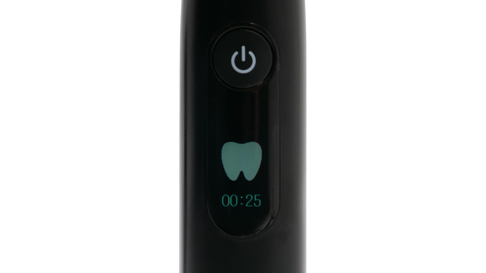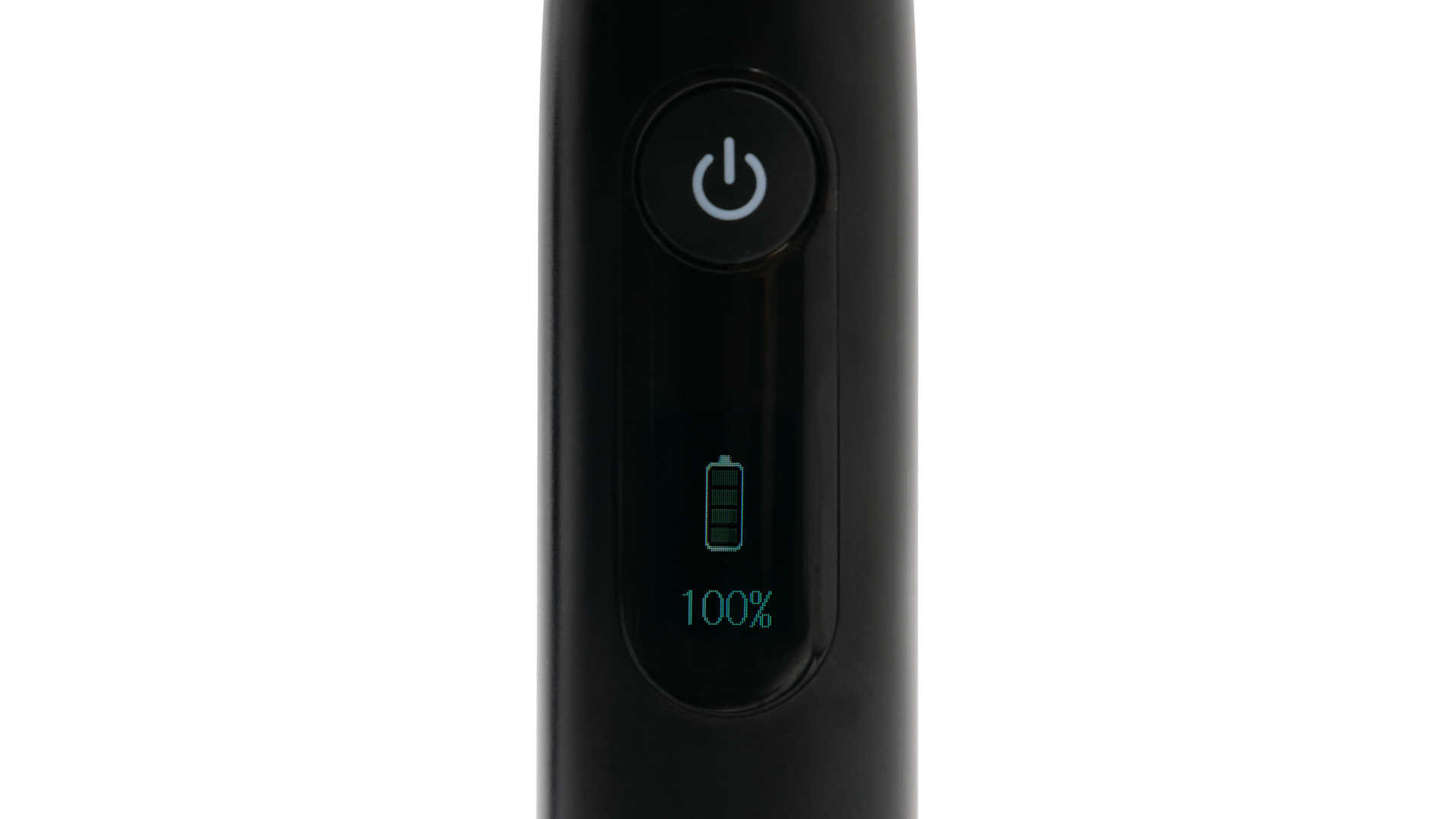 Die Taste, über die man mit der Schallzahnbürste interagiert, lässt sich gut erreichen sowie betätigen. Über sie schaltet man nicht nur das Modell an und aus, sondern wählt auch den Modus. Dass das Bedienelement folglich unterschiedliche Funktionen erfüllt, erschwert die Bedienung zum Glück nicht wirklich und man gewöhnt sich rasch daran. Praktischerweise lässt sich die Taste über die Reisesicherung ausschalten; dann kann sie nicht unbeabsichtigt betätigt werden, etwa wenn das Modell im Rucksack o. Ä. mitgetragen wird. Es stehen fünf verschiedene Modi zur Auswahl, sodass sich die Arbeitsweise der Schallzahnbürste an beinahe jede Anforderung anpassen lässt. Die Intensität der Vibrationen kann jedoch nur über die Moduswahl, nicht aber von dieser unabhängig festgelegt werden. Das Display bildet zweifellos eine große Stärke des Modells: Es stellt seinen informativen Inhalt hell, groß und vor allem scharf dar, sodass er leicht ablesbar ist. Hier erkennt man im Betrieb neben dem eingestellten Modus auch die exakte Dauer des betreffenden Putzvorgangs. Kurz nach dem Ausschalten erscheint hier ein Smiley, der veranschaulicht, ob man ausreichend lange geputzt hat; außerdem wird der Ladestand des Akkus ersichtlich, und zwar präzise in Prozent. Neben diesen hilfreichen optischen Hinweisen erfolgen noch gut wahrnehmbare Vibrationssignale, sobald es an der Zeit ist, mit der Reinigung eines anderen Mundbereichs fortzufahren, oder wenn die optimale Putzdauer erreicht wurde. Auch ein Drucksensor ist vorhanden: Er funktioniert tadellos und schlägt zuverlässig Alarm, wenn man die Borsten zu stark gegen die Zähne drückt (➞ Die Bedienung).