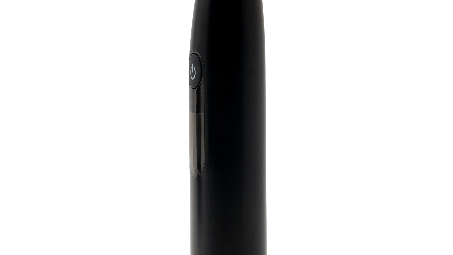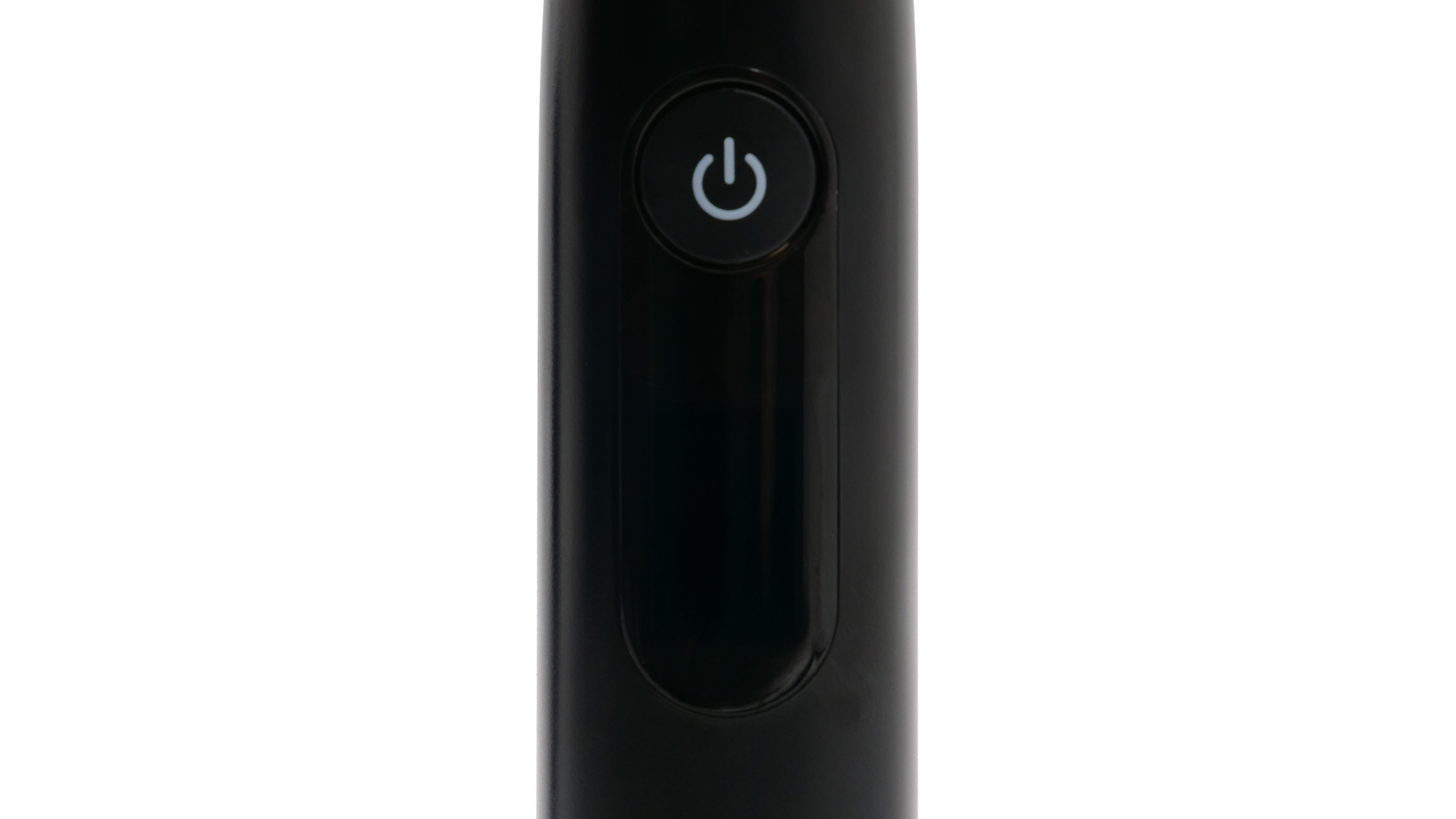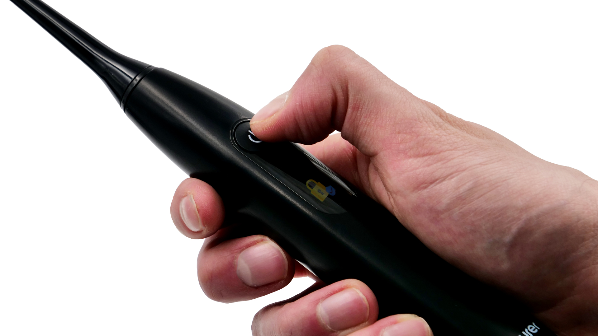 Wie die meisten Schallzahnbürsten besitzt auch dieses Modell lediglich ein einziges Bedienelement. Die Taste lässt sich problemlos mit dem Daumen erreichen; mit einem Durchmesser von ≈ 1,4 cm ist sie mehr als ausreichend groß. Dank ihres tadellosen Druckpunkts kann man sie ohne Mühe betätigen. Weil sie wie das Gehäuse aus hartem, glattem Kunststoff besteht, fällt es jedoch nicht leicht, sie blind zu ertasten. Optisch erkennt man sie hingegen sofort, auch aufgrund ihrer hervorragend sichtbaren Beschriftung: Das An- bzw. Aus-Symbol verdeutlicht die Funktion des Bedienelements unmittelbar verständlich.
